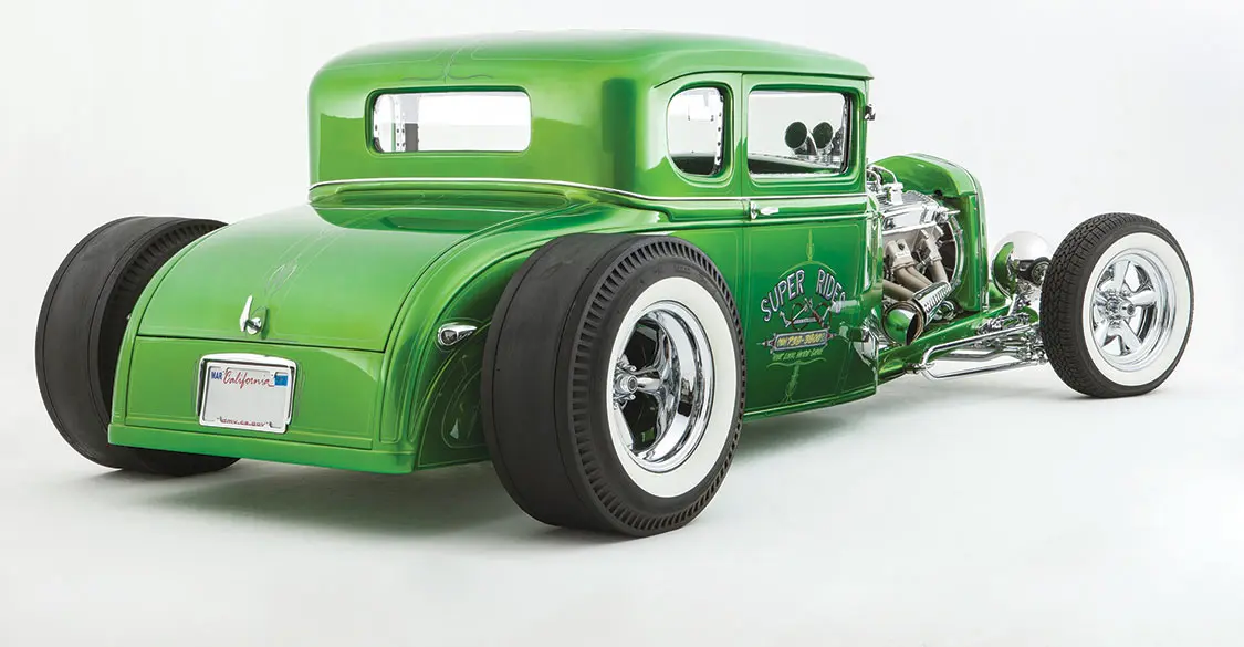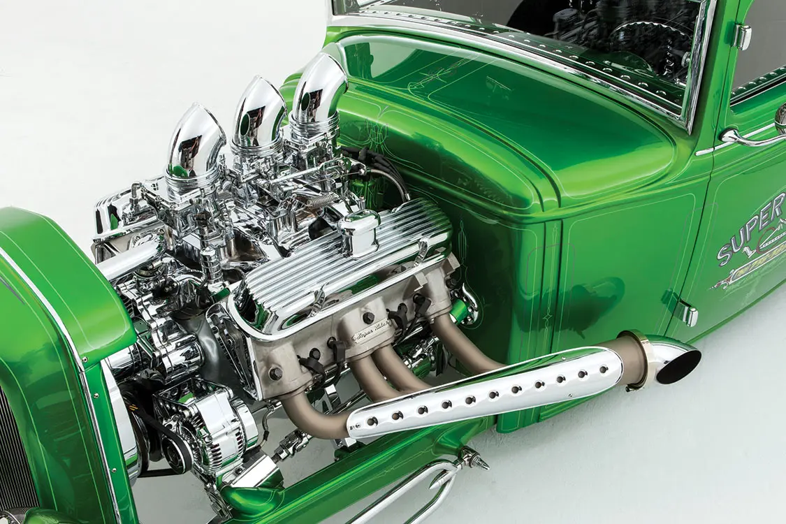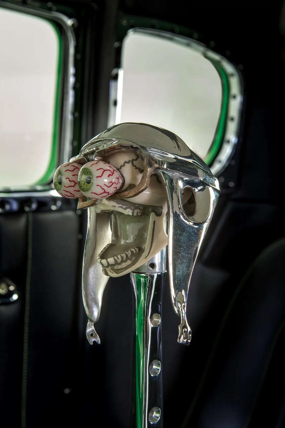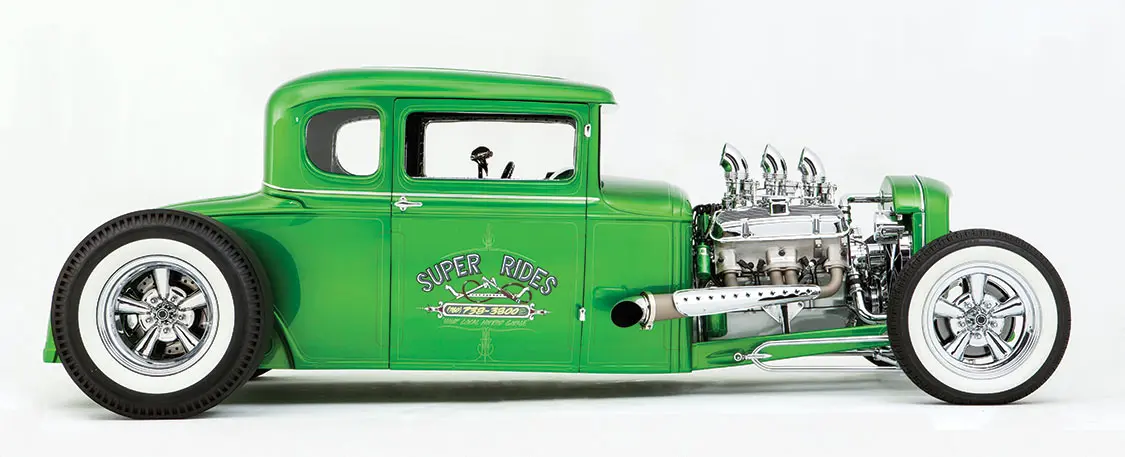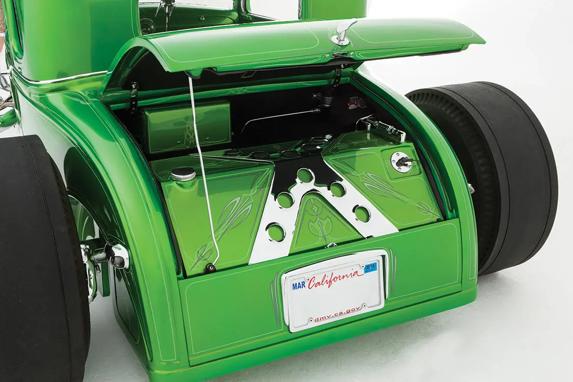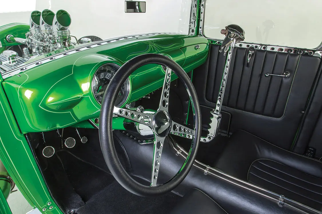 Remember that Jordan started out working at his uncle’s body shop when he was 13 years old, and he went on to become a master painter by the time he was 18. After a 30-year hiatus, he laid down the awesome color you see here. He started with painting everything base white, and then mixed a batch of House of Kolor Lime Time Green, added a little House of Kolor Pagan Gold Kandy concentrate with a pinch of Egyptian Gold pearl, and covered the white. Next he covered it with multiple coats of clear and had Pete “Hot Dog” Finlan lay down pinstriping and lettering. Finally, Jordan buried everything with six coats of clear. A grand total of 18 coats of color and clear consume this ’30 Ford five-window coupe.