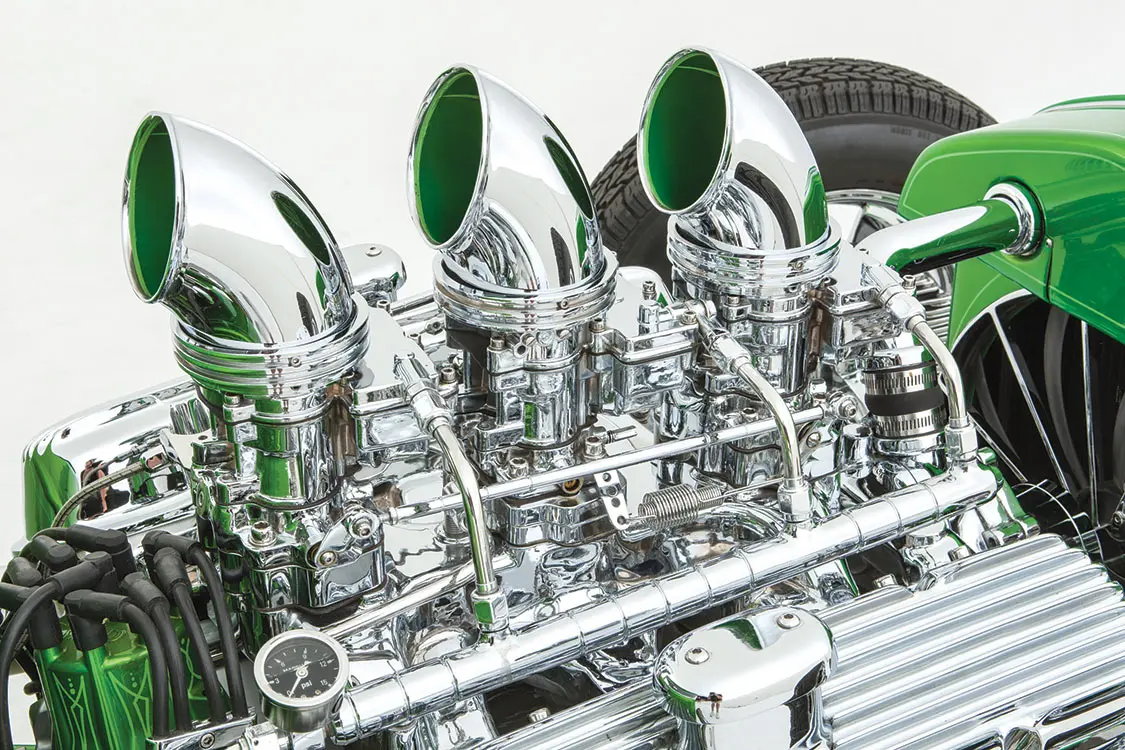 ’67 Pontiac GTO 400-ci machined to 462-ci and assembled by Gregg Scott Racing Engines; Edelbrock Performance aluminum cylinder heads with Mooneyes finned valve covers and breathers; Ames aluminum tri-power intake manifold; custom-made aluminum carburetor spacers with three Rochester tri-power carburetors 1,350-cfm; SCAT steel crankshaft and connecting rods; RaceTech aluminum pistons with an Isky camshaft; custom Super Rides 1 ¾- diameter headers fitted with custom Super Rides heat shield; Electrical charge is produced with a Denso 130-amp alternator; Ron Davis aluminum radiator.