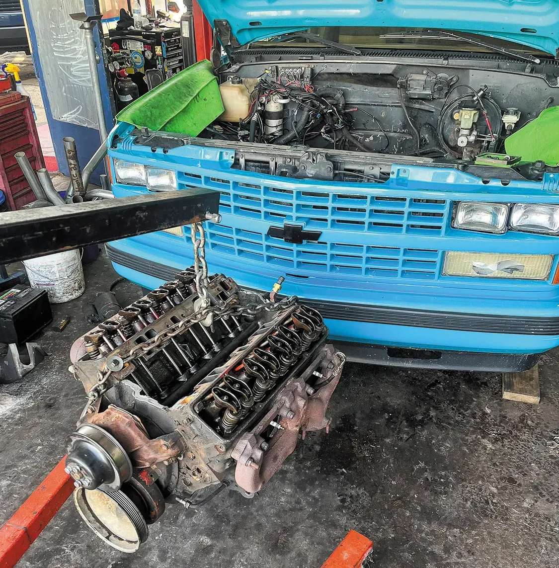 05. In this case, the easy part came first with the removal of the burned-out Chevy 350. We can only imagine what kinda of torture this engine has gone though, so rebuilding it wasn’t really high on our wish list.