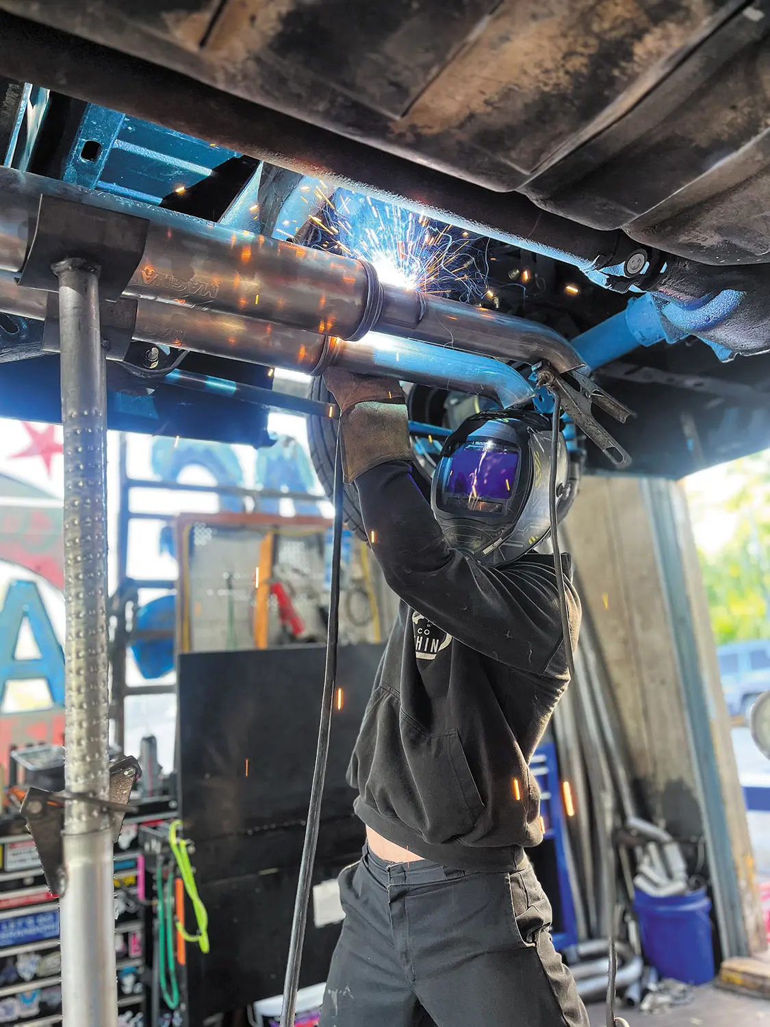 18. With the engine and transmission in place, the focus was exhaust. A universal kit from MagnaFlow with two of its mufflers was the best combo for this. Nick did the welding. The best way to hear it is to scan that QR code we mentioned earlier.