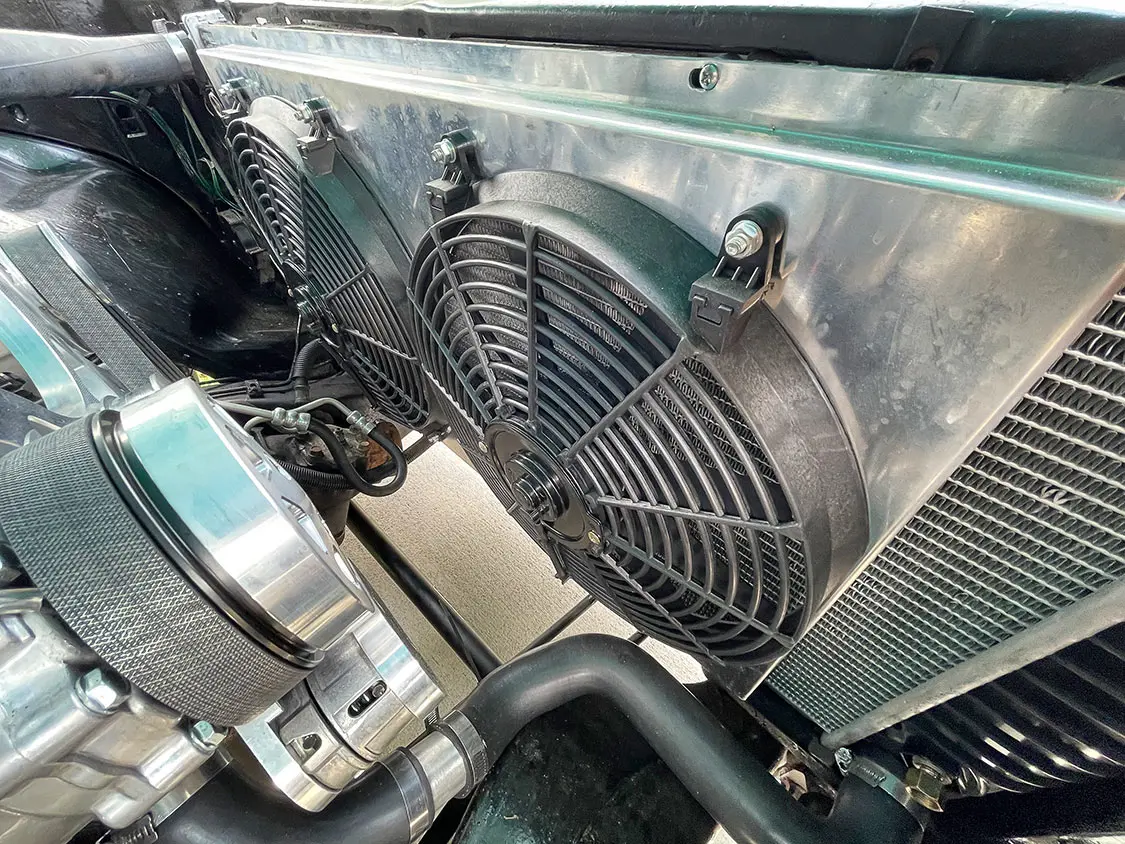 19. Dual electric cooling fans from Mishimoto added extra room in the engine bay as we don’t need a clutch-driven fan.