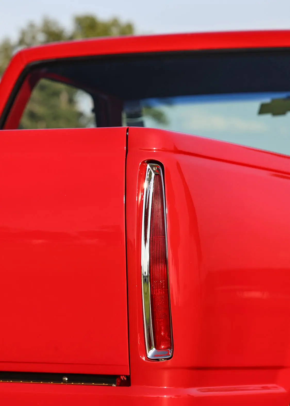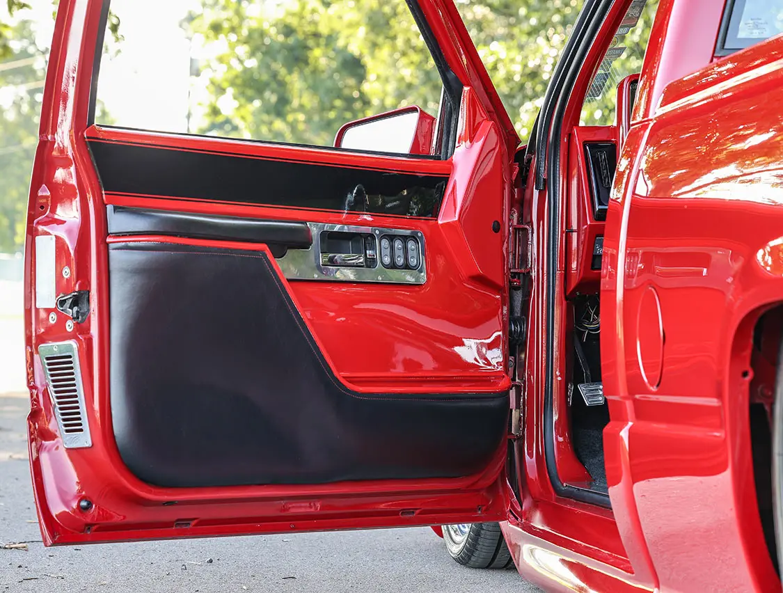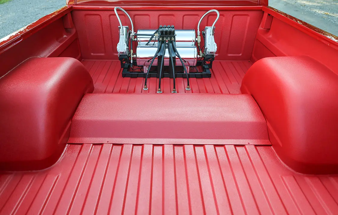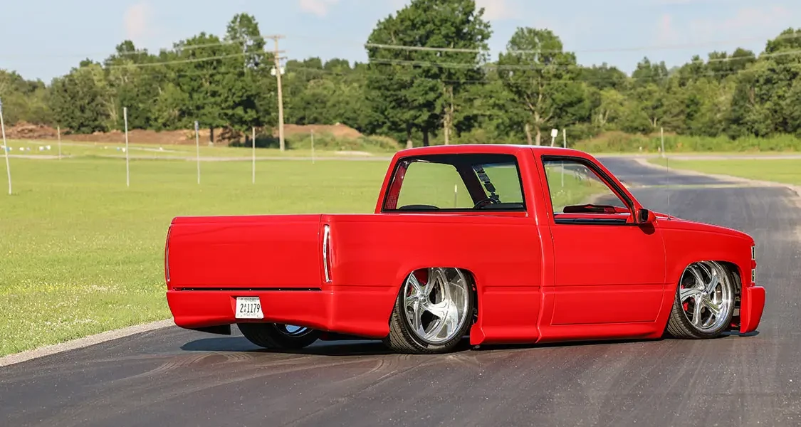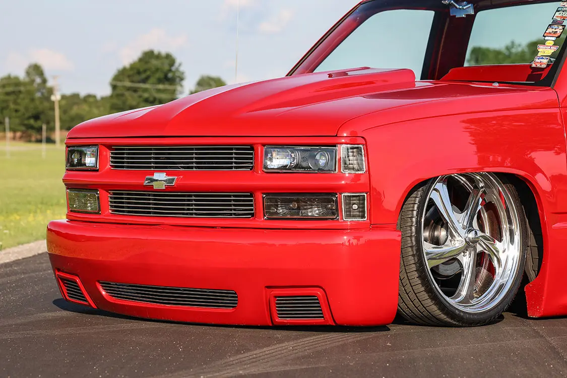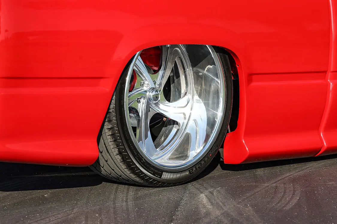 Over the years, Brent has made quite a few changes to make the truck his own, such as smoothing out and molding the body kit to the sheetmetal, installing a custom roll pan, shaving the handles, and ditching the factory taillights for a set of Cadillac units. Painter extraordinaire Gary Bandy then stepped up with a fresh repaint of the truck’s original GM Victory Red color. Gary’s also the dude who installed the latest iteration of the air suspension, which includes a reverse-mounted triangulated 4-link over a narrowed rearend, and a traditional cup setup up front.