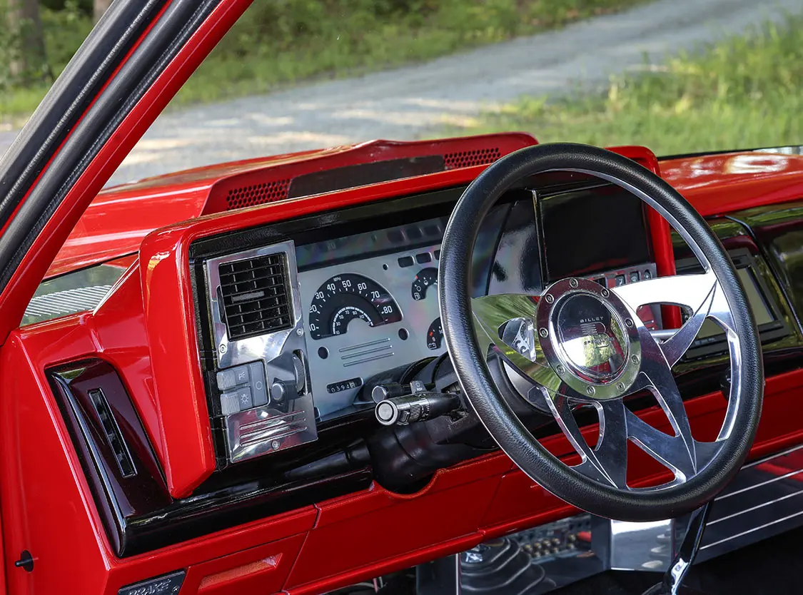 As wild as the rest of the truck is, it should come as no surprise that the interior is every bit as insane. Leather-upholstered S-10 bucket seats were bolted in on either side of the custom subwoofer enclosure, which also houses the air-ride gauge. The door panels and dashboard were smoothed and painted to match the rest of the truck, and plenty of billet was bolted on to brighten things up even more, including a Billet Specialties steering wheel.