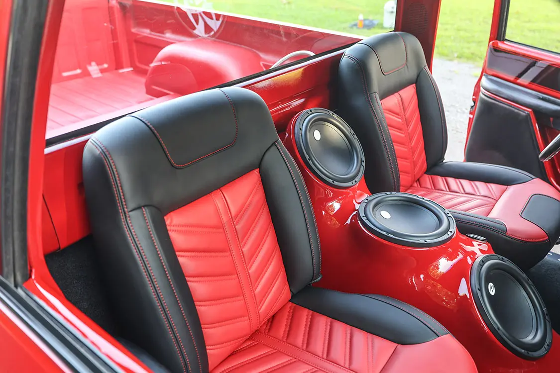 • Chevy S-10 bucket seats upholstered with red and black leather