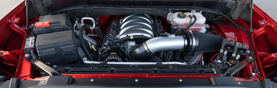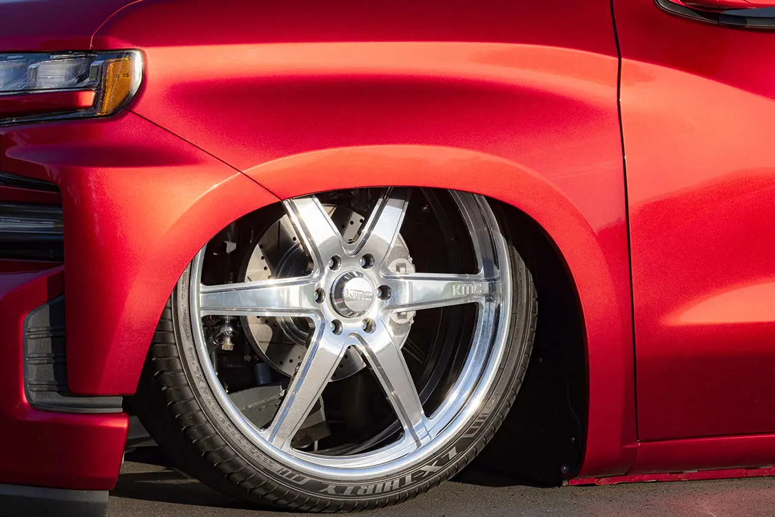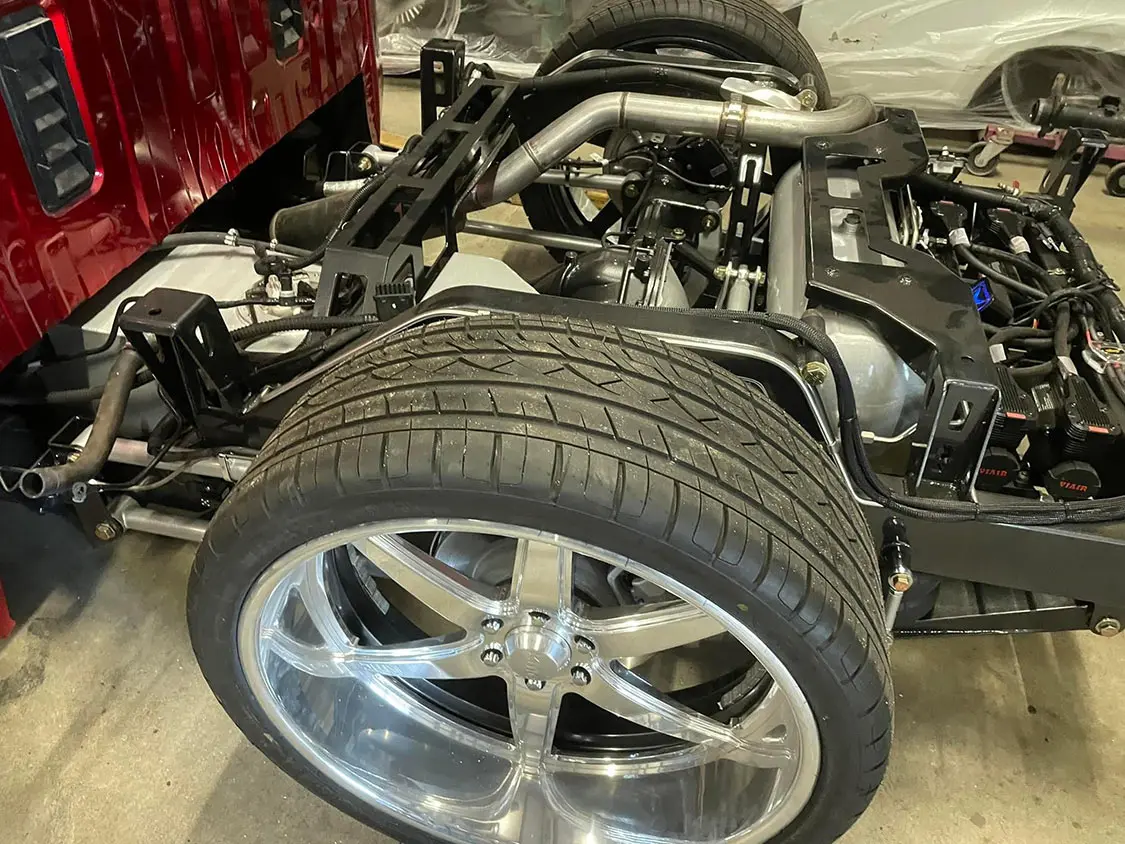 With the chassis fully built and looking its best, R1 Concept rotors were added before a set of 26-inch KMC wheels wrapped in Lexani Tires were bolted on. No rolling chassis would be complete without an engine, so the factory 5.3L V-8 was moved from the stock chassis to this new custom chassis. A custom intake and painted engine covers came next, and a custom Magnaflow exhaust was added to let the engine breath and look better. Jimmy had to modify the firewall, bed floor, and cab floor to clear the new larger wheels as well as several other sheetmetal modifications to make it all fit correctly on the new chassis.