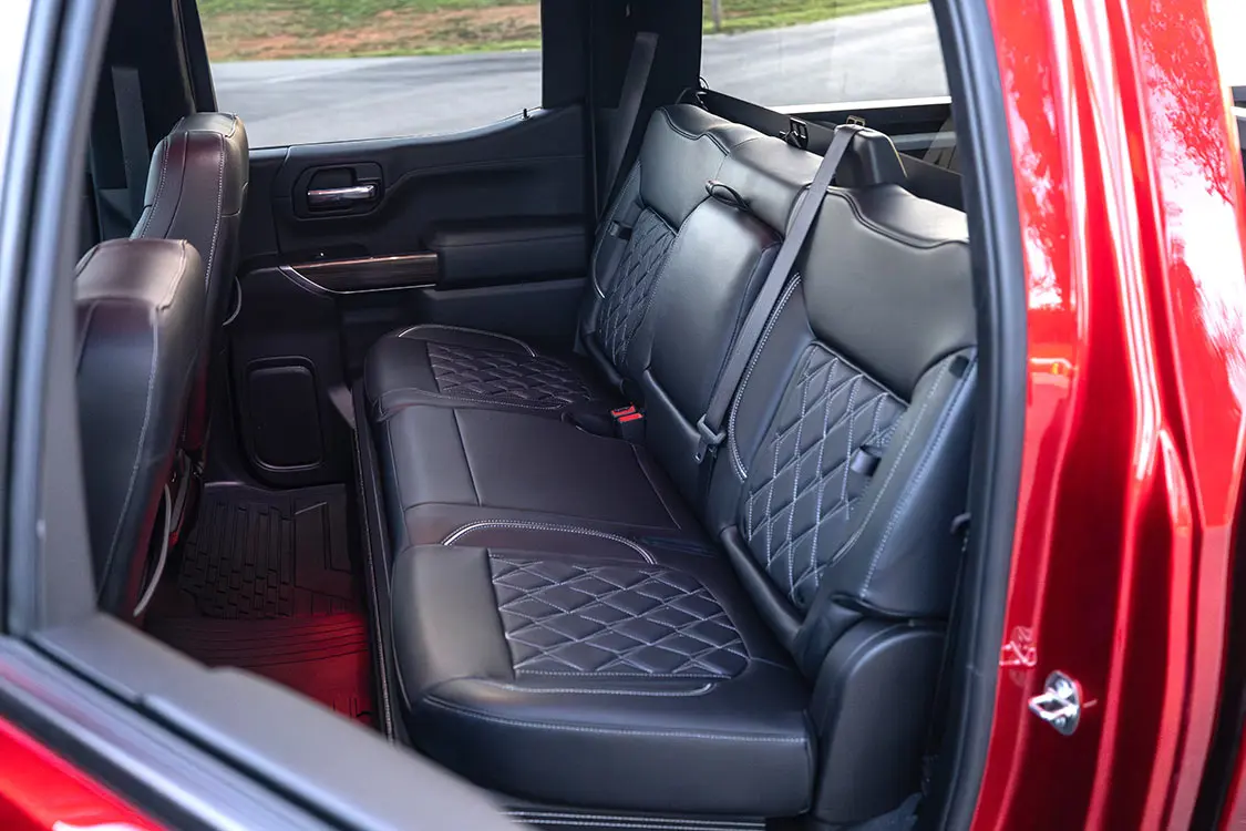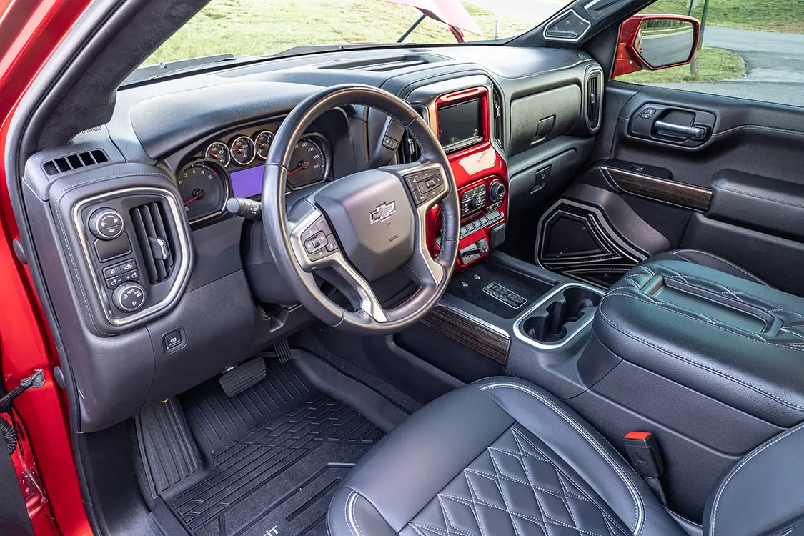 The rear bumper was removed, and a custom-built roll pan was welded in its place. The doors and rear of the bed had to be painted after the bodywork. Even though the stock Bright Red paint on the truck would be fine for most people, Ricky decided to change the color. Glenn Strickland at GG Auto Salon in Orange Park, Florida, sanded down the factory paint and laid down an Orion Silver base before the House of Kolor Candy Apple Red candy coat was added before the clean. This completely changed the look of the truck. The underside of the cab and bed as well as inside the bed all received a coating of Line-X bed liner. Ricky said getting the schedule of the chassis build and paintwork to line up proved to be a challenge, but as you can see, it all worked out.