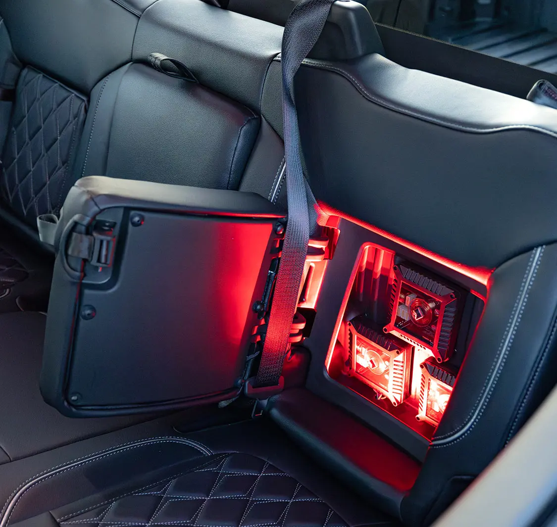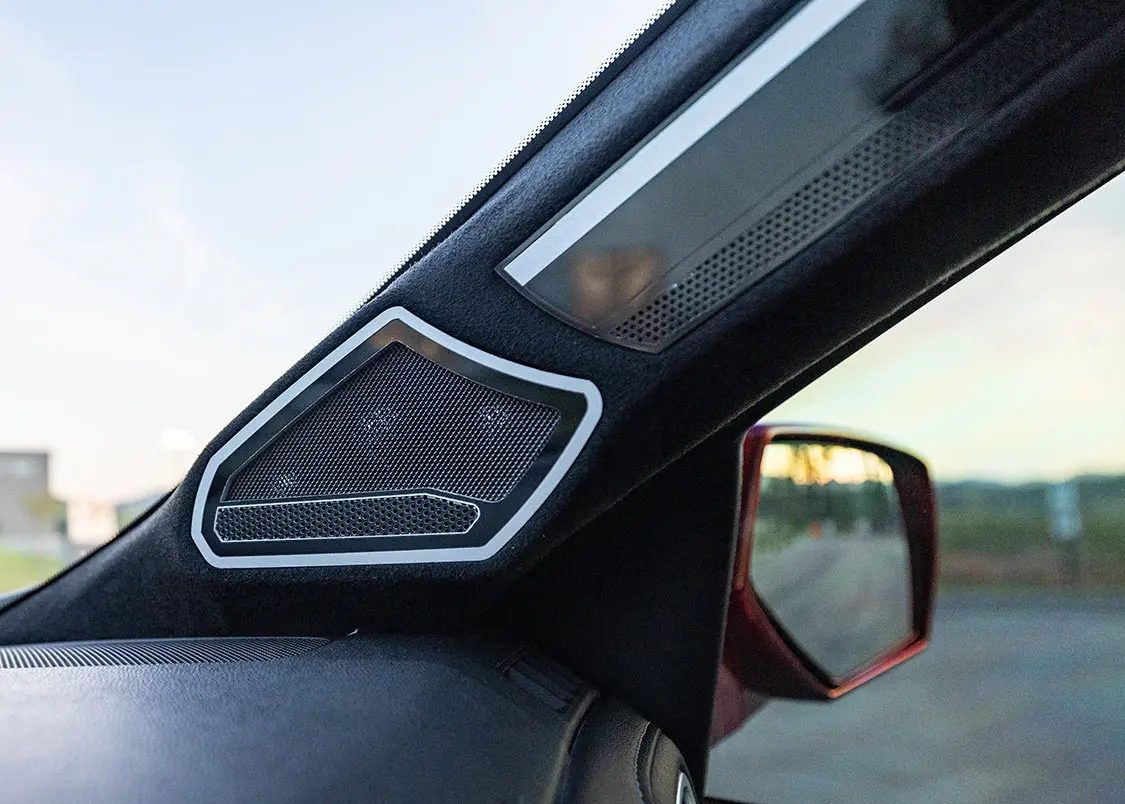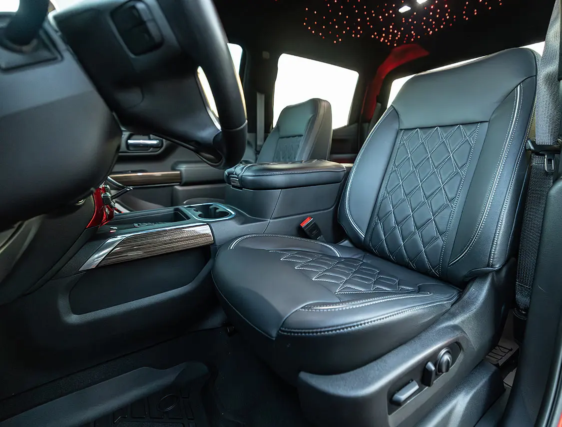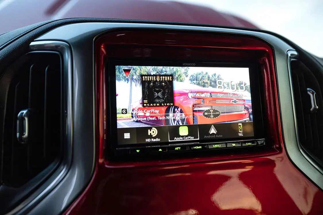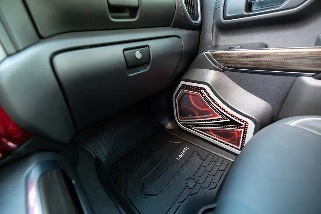 With the truck back from paint and finally mated to the chassis, Ricky turned to the interior to round out a full build. He gutted the interior to get the metalwork done, which made working on the audio and interior upgrades easy—no need to remove the parts since they were already out. For seats, black Roadwire leather seats with silver stitching were added by 904 Motor Sports. Ricky built a custom dash bezel to house the Kenwood head unit in the stock location, while MTI built his custom A-pillars and door panels to house several Rockford Fosgate speakers. MTI also built the sub box for under his back seat that fits four 10-inch Rockford Fosgate T1 subs. The headliner received black suede and starlight install as well as matching suede on the pillars.