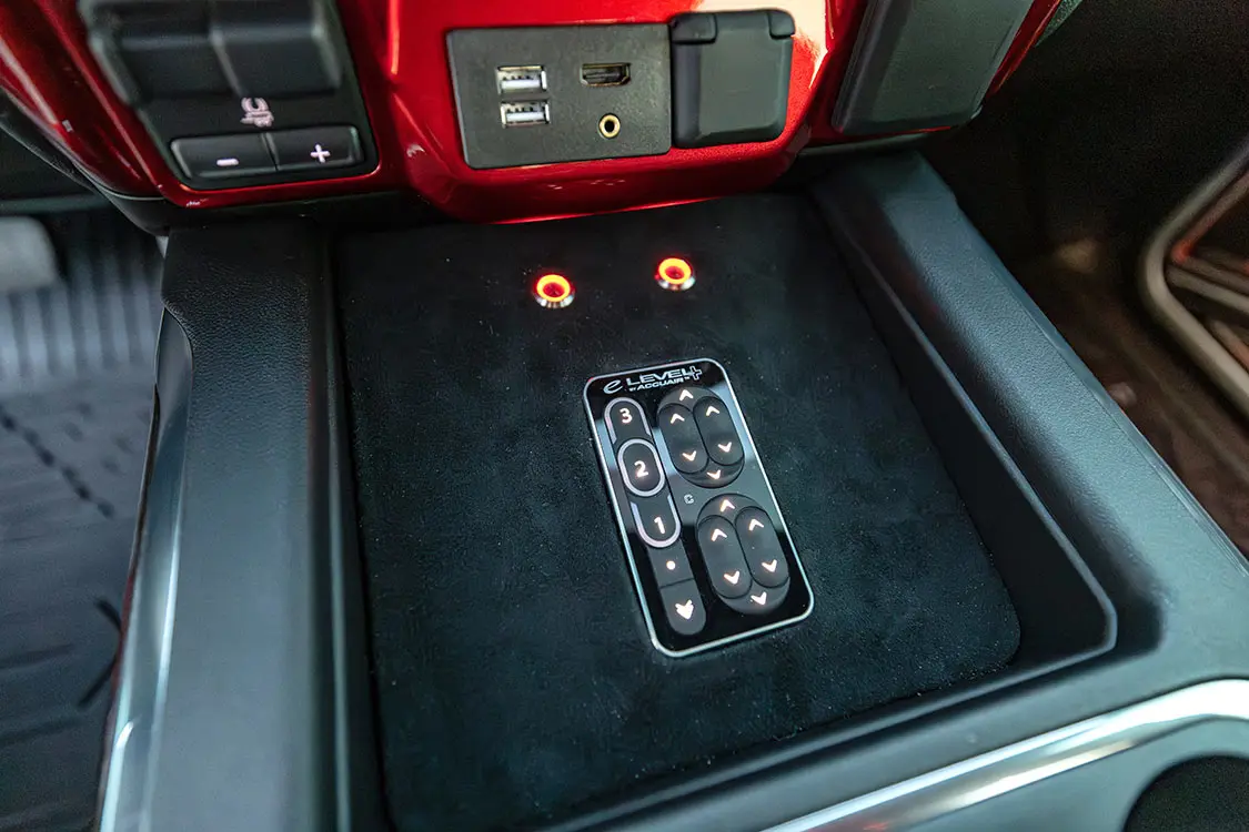 Before the chassis was bolted together for the last time, all parts were sent to be powdercoated in Cadillac gray and silver to not only withstand the salty Florida air, but to also look good while doing it. Once back together, custom tabs for the stainless air lines, four Viair 485 compressors, 8-gallon air tank and all the factory wiring, fuel lines, and brake lines were built so that everything under the truck was a work of art in its own right. An Acuair E-Level Plus air management was also added to control the trucks height.