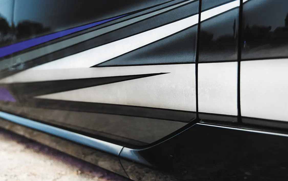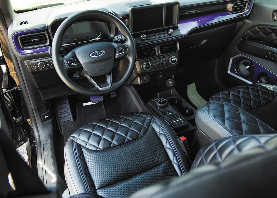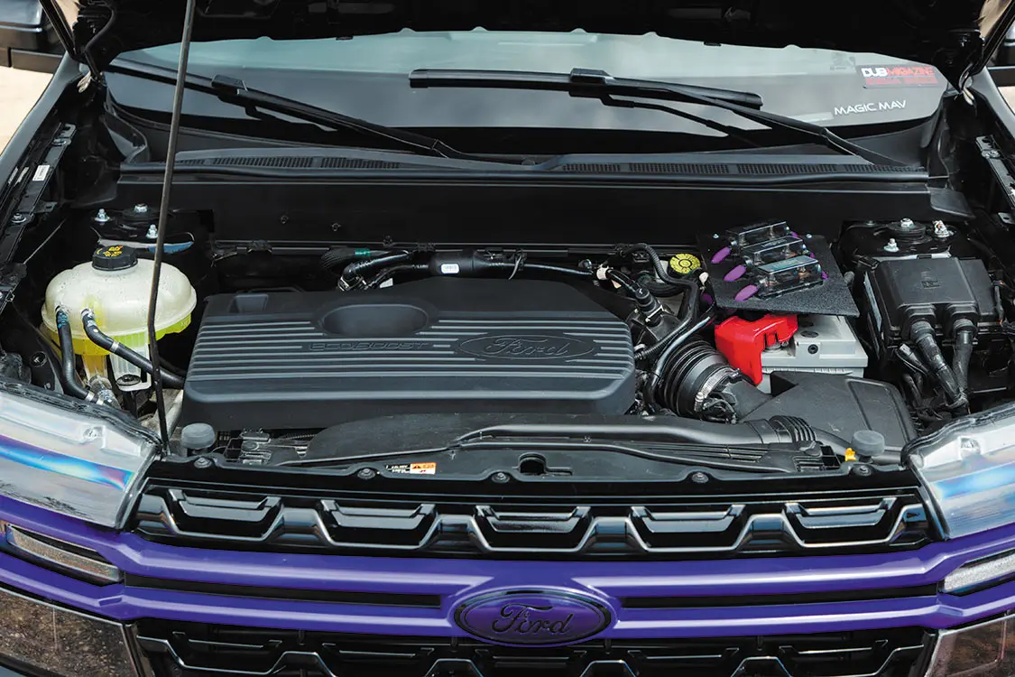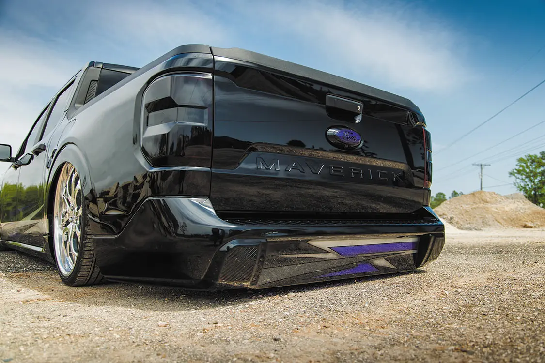 To push the redesign even further, Adam then added some paintwork to the grille and light lenses, color-matched the bumpers, and recruited Brandon McCoy at Gooch Customs to add some killer graphics to the bottom half of both sides of the truck. The dose of color and styling is sparingly tasteful as to not detract from the overall smooth flow the Mav had going for it up to this point.