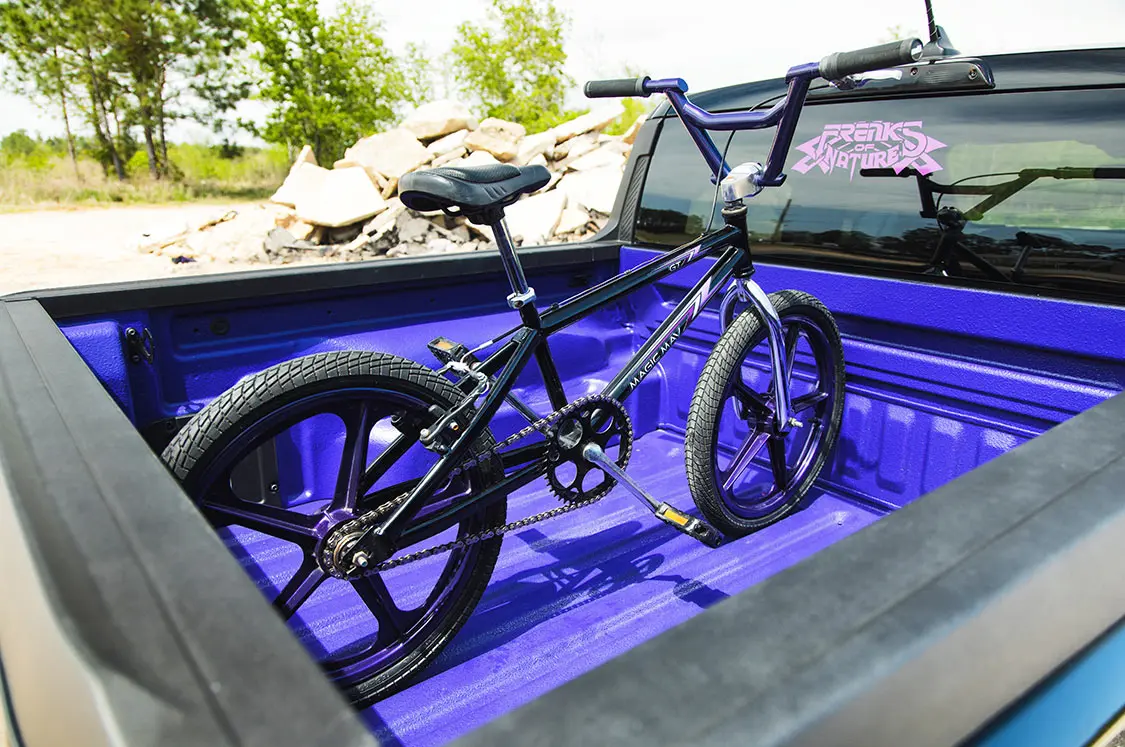 First on the list of things to address was the Maverick’s factory chassis. Adam envisioned this truck absolutely slammed, and to do just that, the front upper frame rails and strut towers were replaced and lifted 4 inches. A problem did arise when trying to get his hands on the left upper frame rail, however. It was placed on backorder at the time when Adam needed it, and it still may be, but to save time and frustration, he created his own by sectioning and splicing a right side rail to mimic a left side. With the addition of Air Lift universal air struts at the front and Slam Specialties ‘bags at the rear, along with Viair compressors and a 3H air management system, Adam’s Mav was soon resting in the weeds.