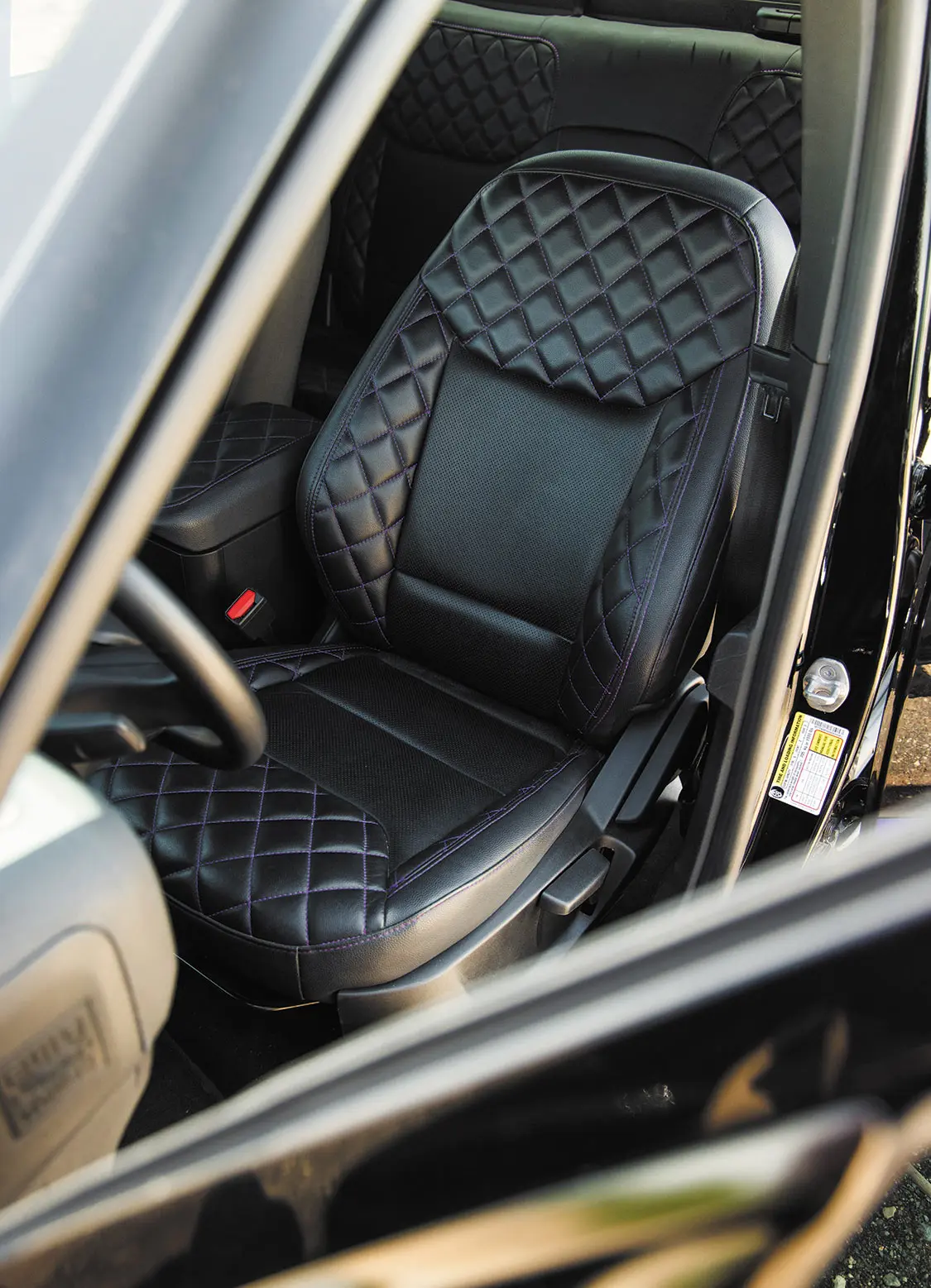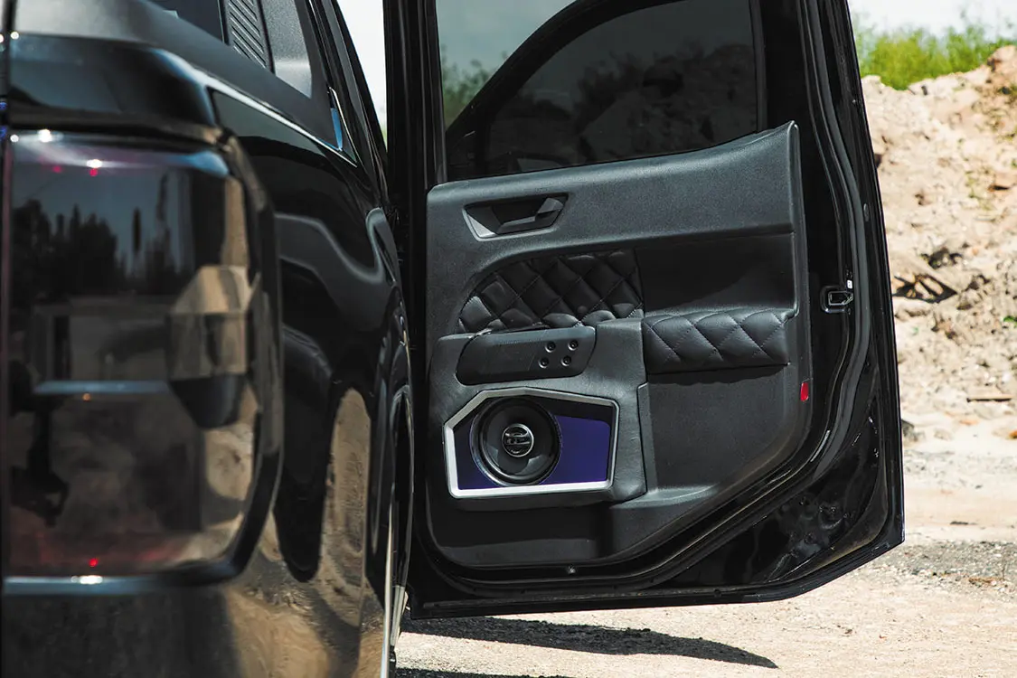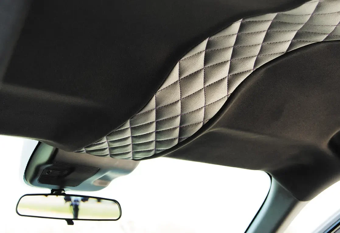 The outer appearance was spot on with what Adam wanted, and his plans for the interior were about to be rolled out to meet his standards. Local shops Sew ‘n Sew Upholstery and Audio Envy teamed up complete a full color change inside of the cab while upgrading the vibe of the otherwise boring factory interior space. Roadwire diamond-stitch black leather covers were utilized to dress up the seats, and matching panel inserts and a full headliner were also cooked up for an all-encompassing diamond stitch theme throughout the cabin.