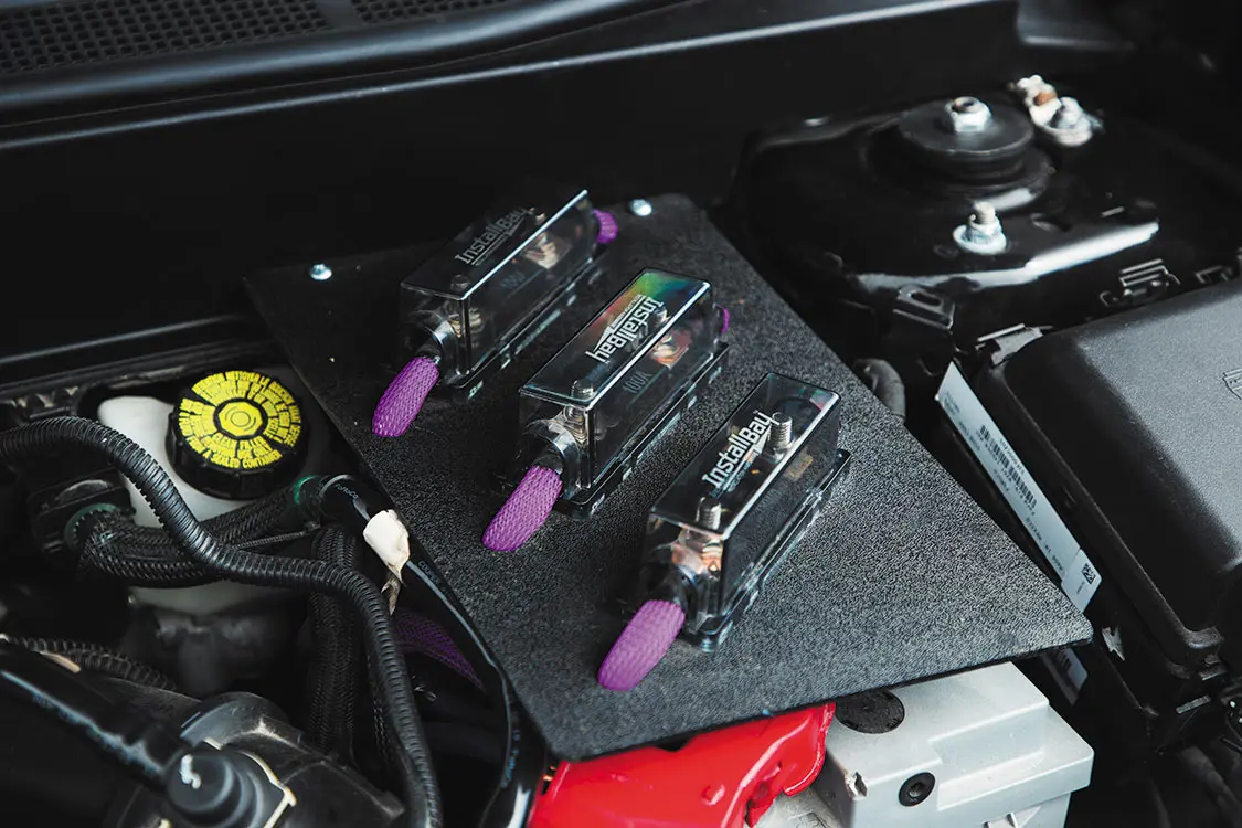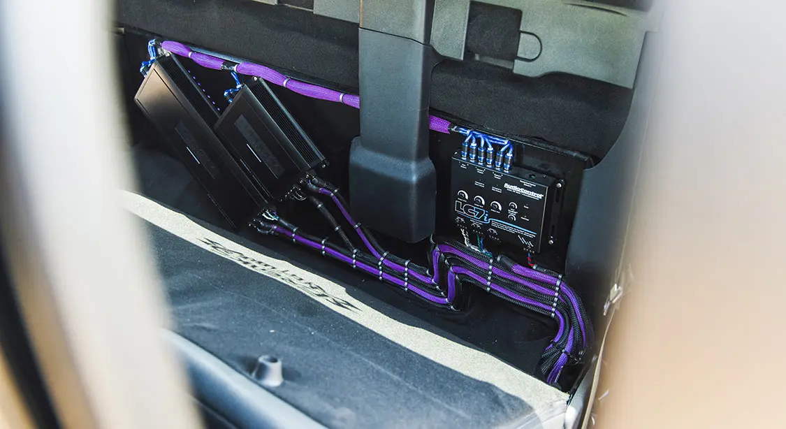 Because Adam was looking forward to increasing the output of the truck’s sound system, a wide array of Db Drive/Euphoria audio components were gathered and a one-off sub box was put together to stash underneath the rear bench seat. While the amps and wiring have also been tucked away behind the seat, Audio Envy created a custom amp rack and displayed the wiring in a clean, attractive fashion just to know that no shortcut was taken—every detail was given proper attention.