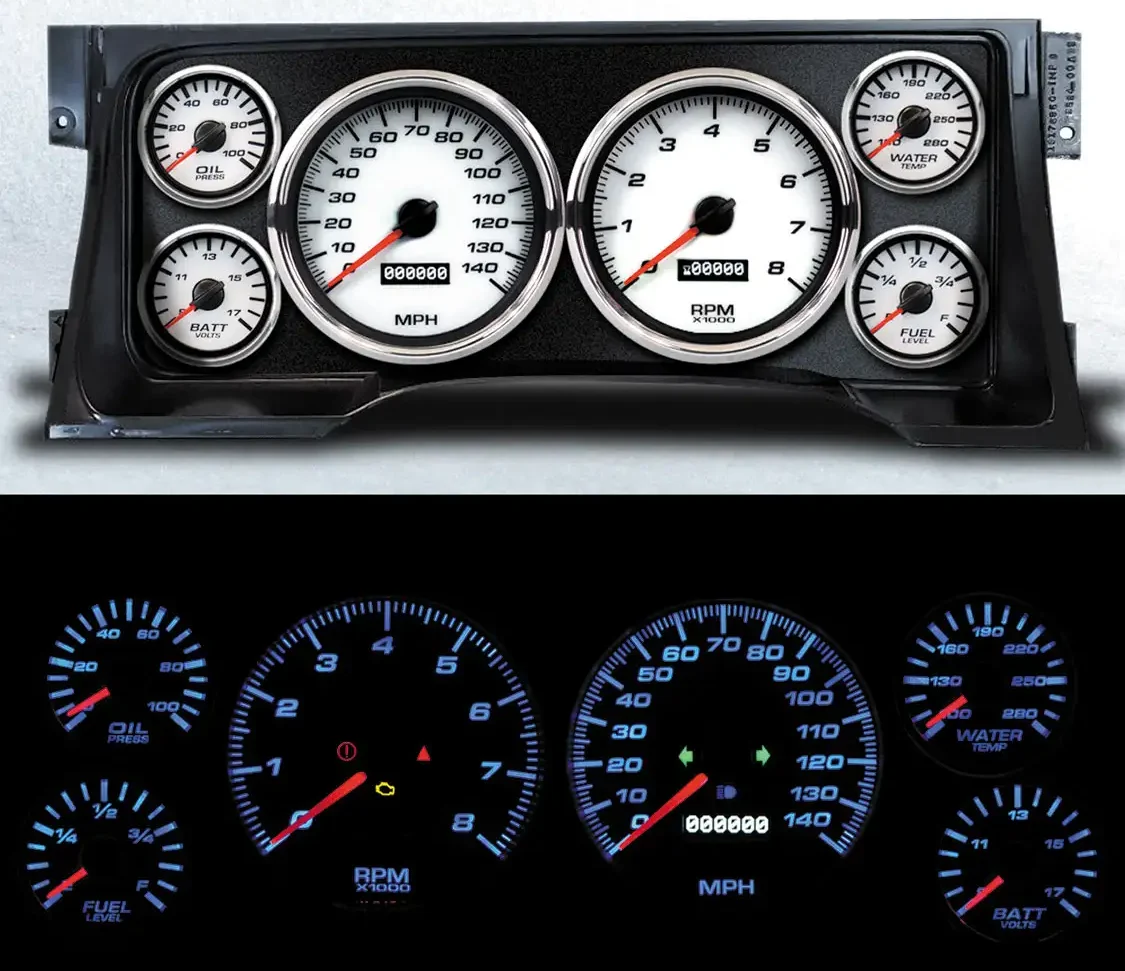 Upgrade your OBS GM truck’s interior with NVU gauge packages, which are perfect for enhancing both style and functionality. With a variety of styles to choose from, these kits install seamlessly in the factory location using stock mountings and can reuse the factory lens carrier for a polished finish. Each kit includes a bracket for installing any NVU 6-gauge set with a 4-⅜-inch speedometer and tachometer.