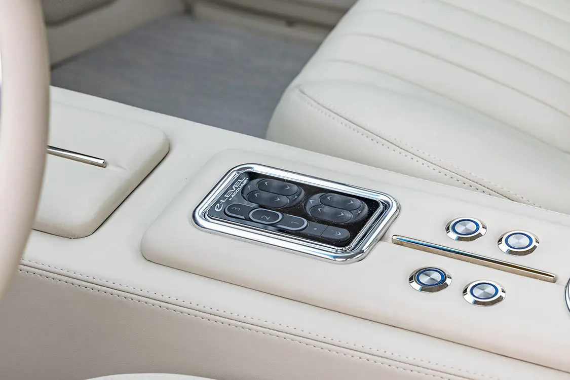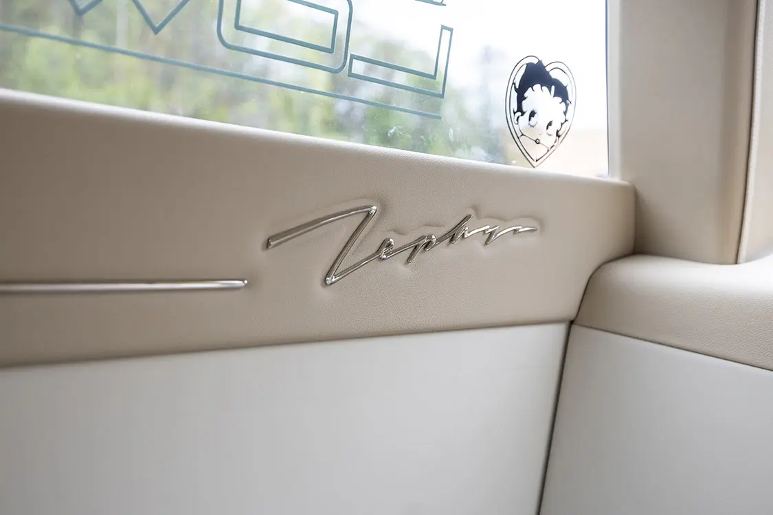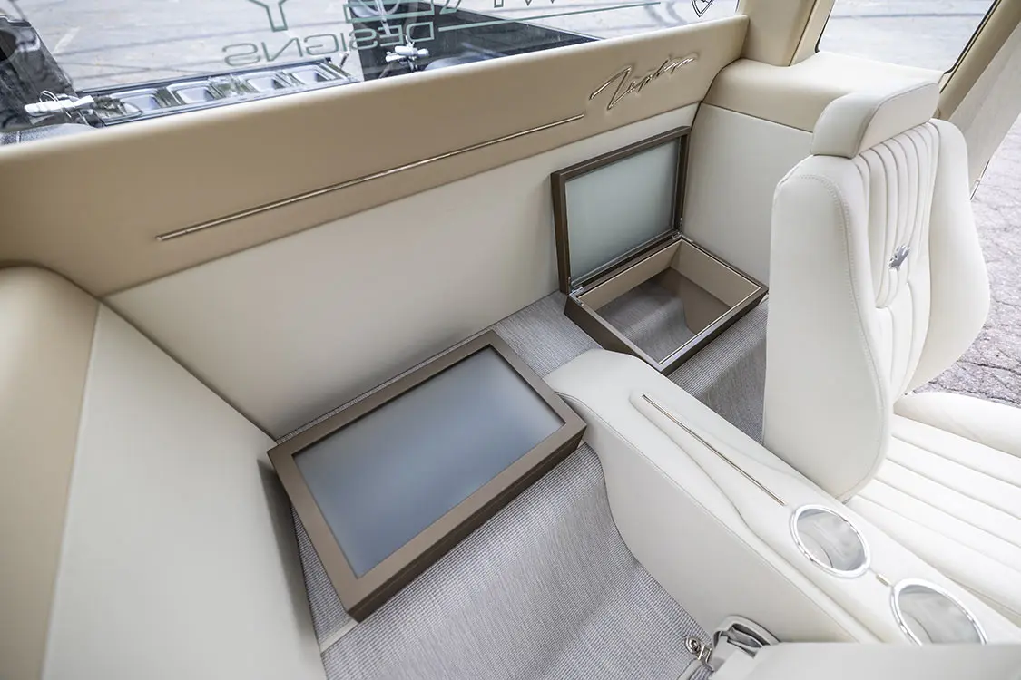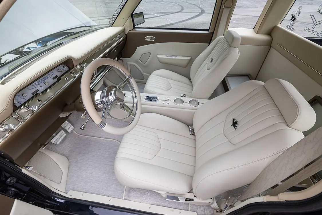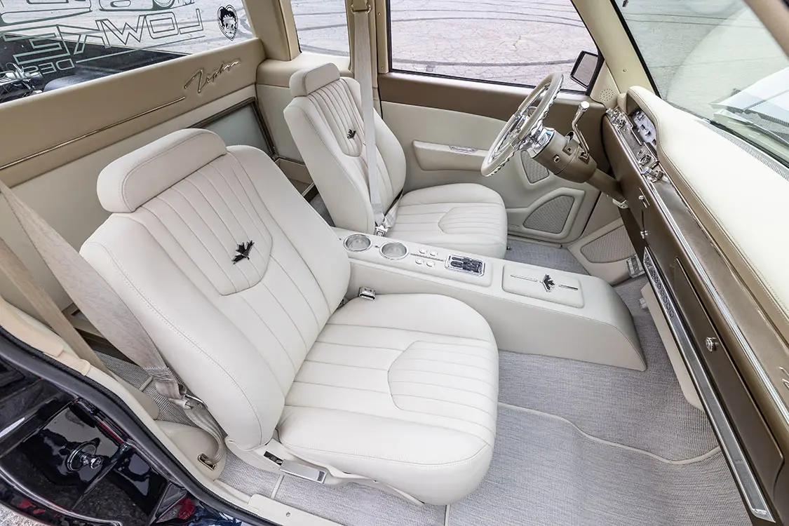 Dakota Digital gauges were custom fit into the dash before it was wrapped in supple ivory-colored leather, as were the reshaped seats, center console, and door and cab panels. A contrasting bronze color was painted to break up the monotony as well as to make a match to the Schott wheels. The remainder of the cab space took shape naturally to create a landscape that jibes together perfectly. To add a very personalized touch to the interior, James incorporated his love of wristwatches into the creation of dual storage compartments at the rear of the cab that were designed to mimic the style of watch display boxes. James and his brother Jeff created a stunning high-end cabin that is fit for the most elegant of rides.