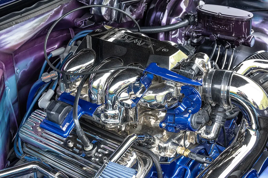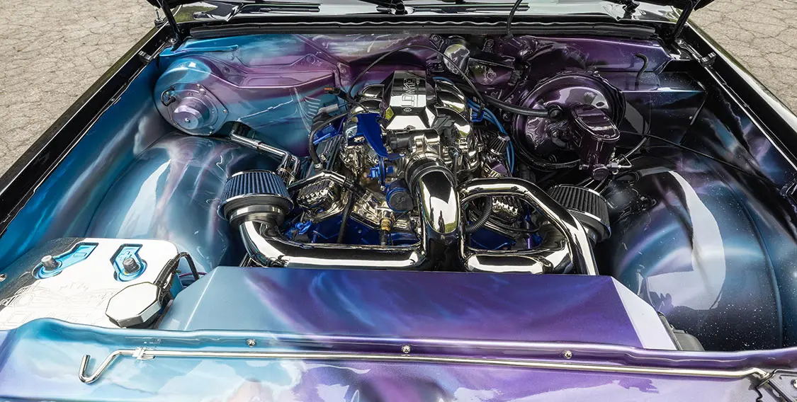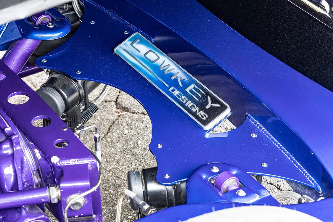 Ivan Benic was asked to work his airbrush magic to spray an intricate day and night theme spread across the bay. James also got down with a few custom billet touches in the form of a one-off intake cover and battery tray and hold down that have been adorned with his own Lowkey Designs logo, along with matching radiator and oil filler caps. To say this engine compartment is unique is a wild understatement.