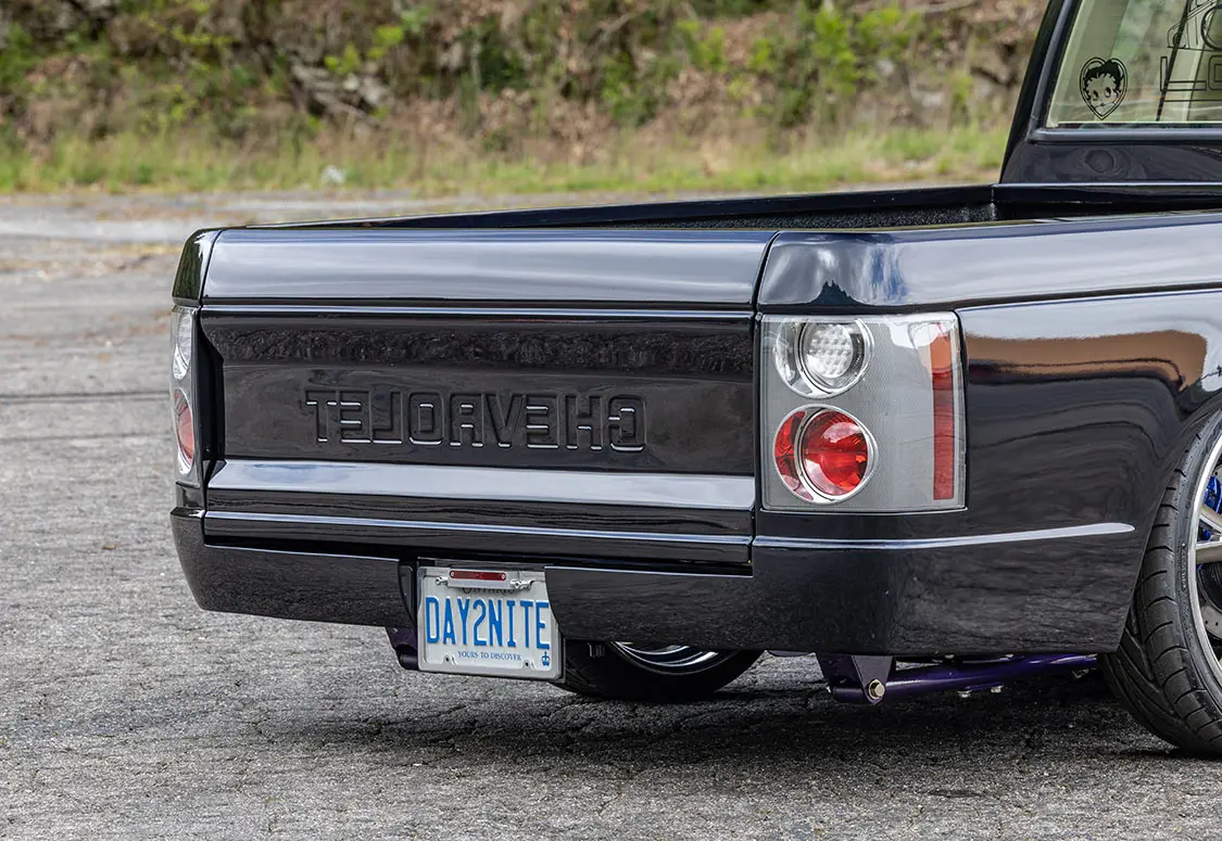 James envisioned his truck to look trick yet understated once the dust settled, and both goals have since been attained. The S-10’s body panels have been worked smoothed, but it’s the little tweaks that pull attention to the truck. The frontend was outfitted with a full-size OBS Chevy bumper that has been cut to fit. In fact, two OBS bumpers have been utilized—the other one was flipped upside down and modified to serve as an air dam that has been stuffed with a set of Frenched PIAA driving lights. A 1991-’93 GMC grille and radiator support also found their way onto the S-10, as did a Stull horizontal bar insert with a custom Day2Nite emblem, top and bottom headlight covers, and one-off blue turn signal lenses fabricated by Jason Rhodes at Klearz in Ottawa. The frontend sports a traditional dignified appearance, while the rear of the truck was treated to a slightly more radical touch.