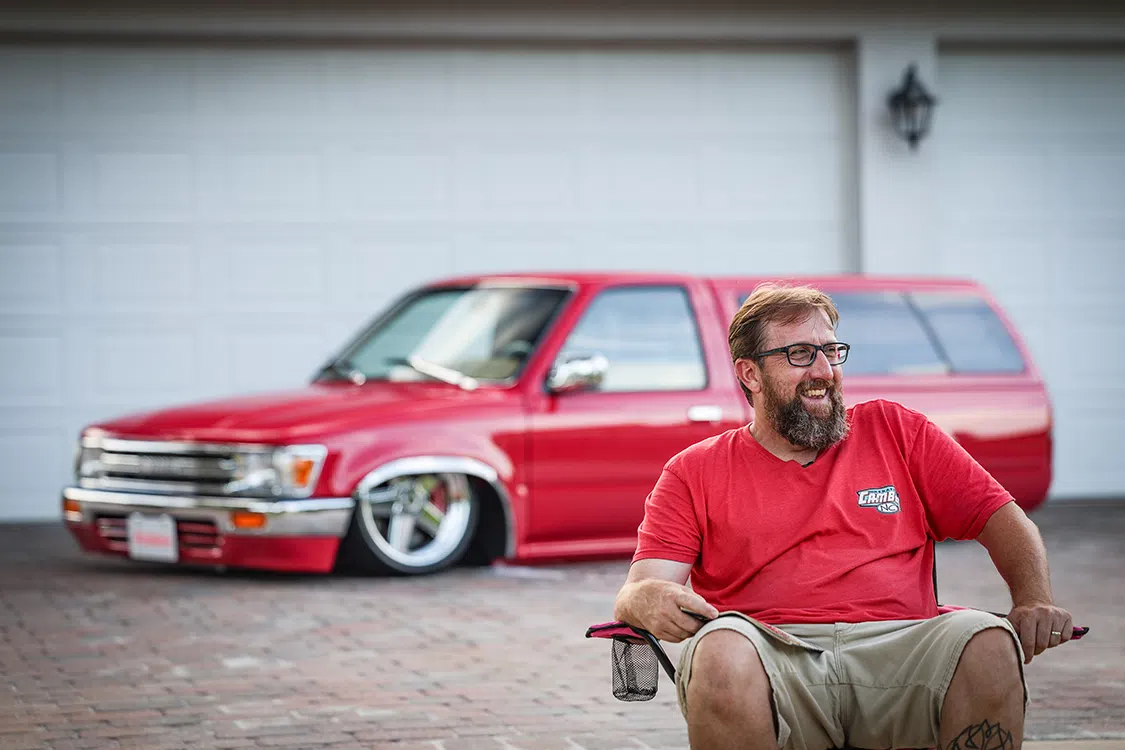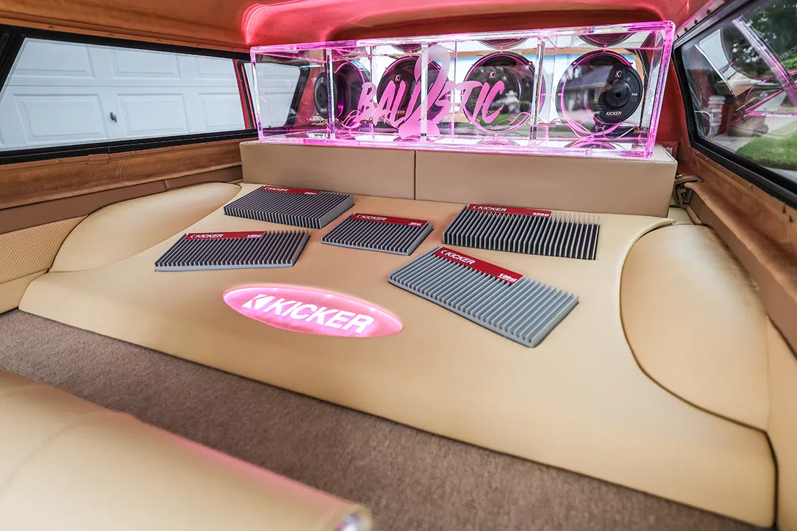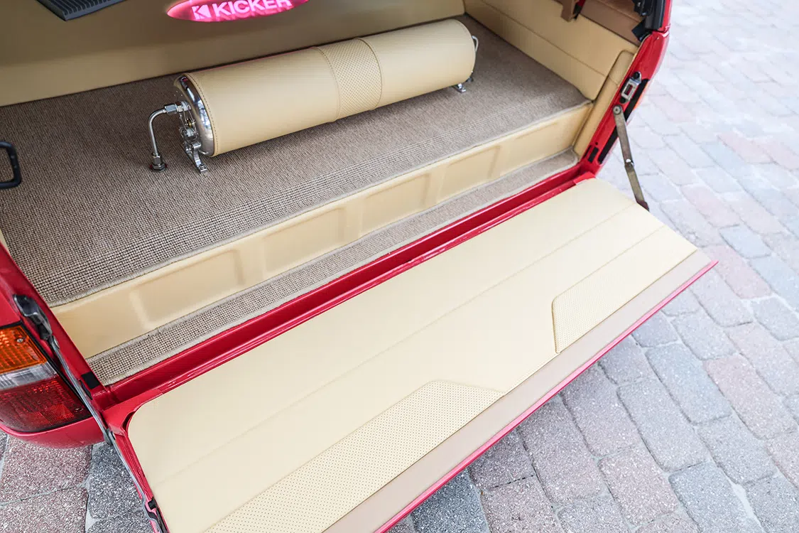 The beauty of running a hard camper shell is being able to make use of the extended interior space, which was also maxed out with a full plexiglass box built by Matt Reynolds. It has since been outfitted with four more subs and pink lighting for a truly old-school take on placing audio components on full display. The assortment of Kicker amps in the back only validates that aesthetic. Oh, and don’t overlook that one-off Ronal steering wheel that matches the actual R9s! Randy did not fumble the ball when it came to orchestrating a truly all-star collaboration of skillsets showcased throughout his Toyota’s interior.