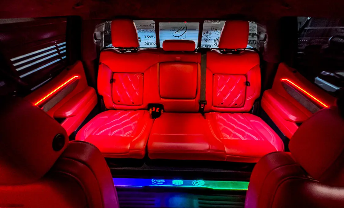 The first thing was to ditch the black leather seats for something a little flashier. Classic Soft Trim in Charlotte, North Carolina, installed Roadwire Leather seat covers and matching center console cover in full red leather with diamond stitching to match the exterior color. This instantly changed the interior look, but I felt it needed more.