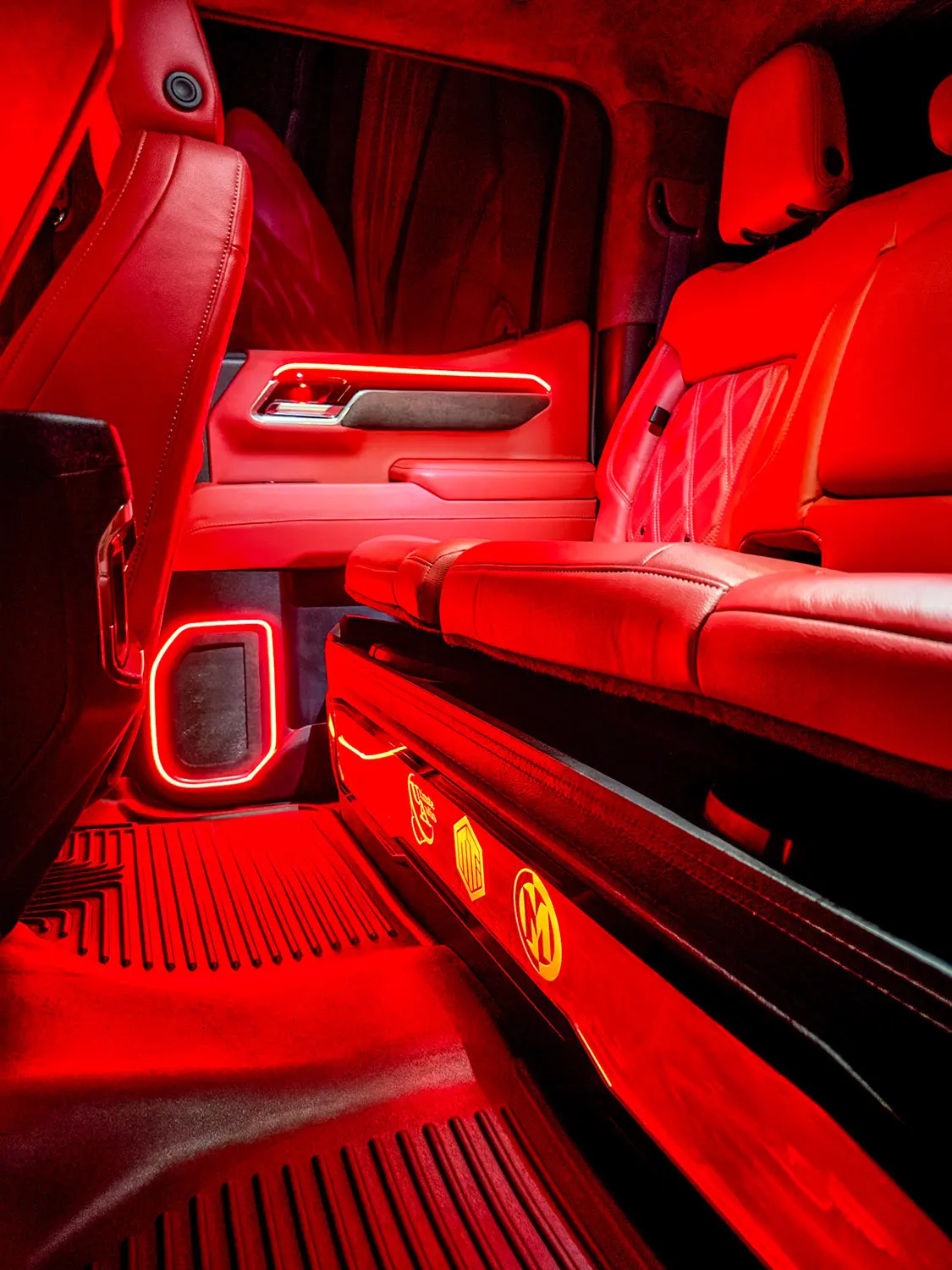 Noticing that the factory brown woodgrain would look out of place with all the red, it was all pulled and sent to Trey Steele at TS Paint Shack to paint it all piano black to match the factory dash bezel. I was also having the 3rd brake light color-matched, but to do so, the headliner had to come out. Since it was out, I decided to wrap it and the pillars in gray suede to up the luxury look even more. In the doors, custom speaker grills were built to retain the factory speaker pockets that now house a 6.5-inch Memphis Audio mid and matching tweeter. MTI A-pillar pods were added to hold the Memphis Audio 3.5-inch mid and tweeter on each side. MTI also built an under-seat sub box to hold two 12-inch Memphis Audio MB subs. The rear seat had to be raised 2 inches to give enough air space for the subs. While all the panels were apart, a multicolor Racesport Lighting kit was added, which gives the new interior a cool look at night. We also added a set of Husky Liner floor liners to protect the floor and from daily dirt and water.