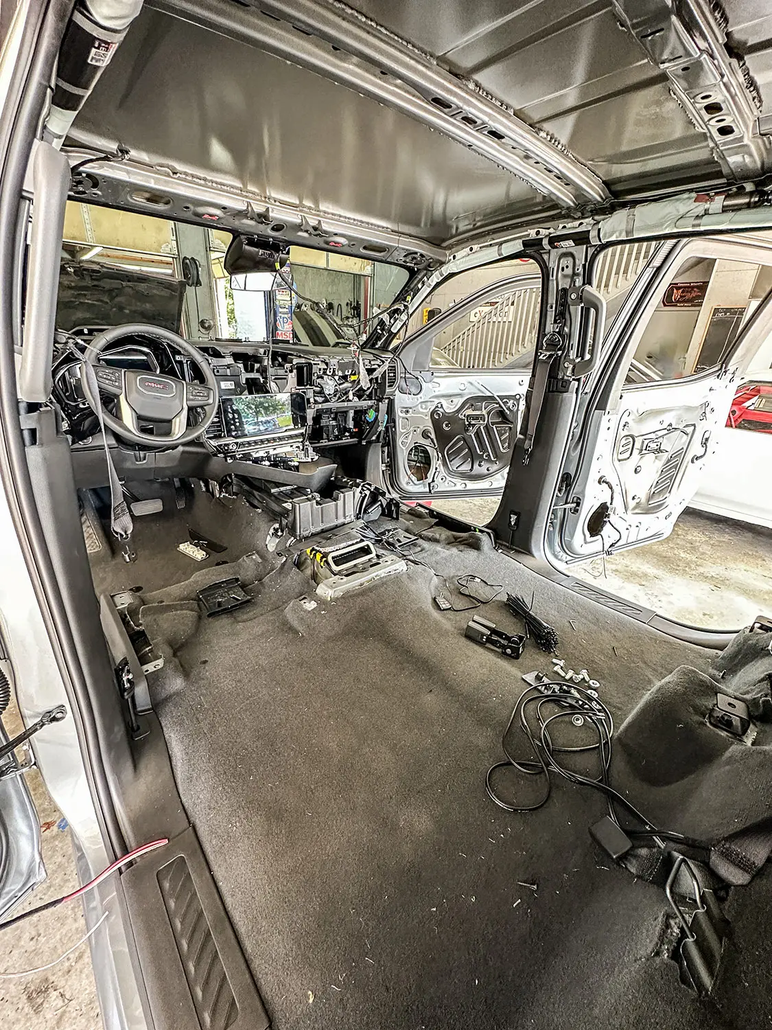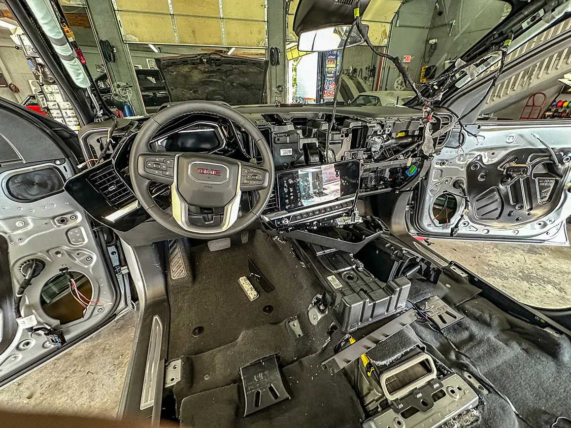 In this instance, I purchased a 2023 GMC Sierra Elevation, which was well equipped. It had black leather seats, woodgrain trim, upgraded audio, and a pretty nice interior. The audio that came with the truck was actually impressive. My first thought was, “Maybe I should leave the factory speakers and be content.” Then instantly, it switched to, “Let’s see how loud we can make this trucks stereo and still keep a clean, factory look.”
