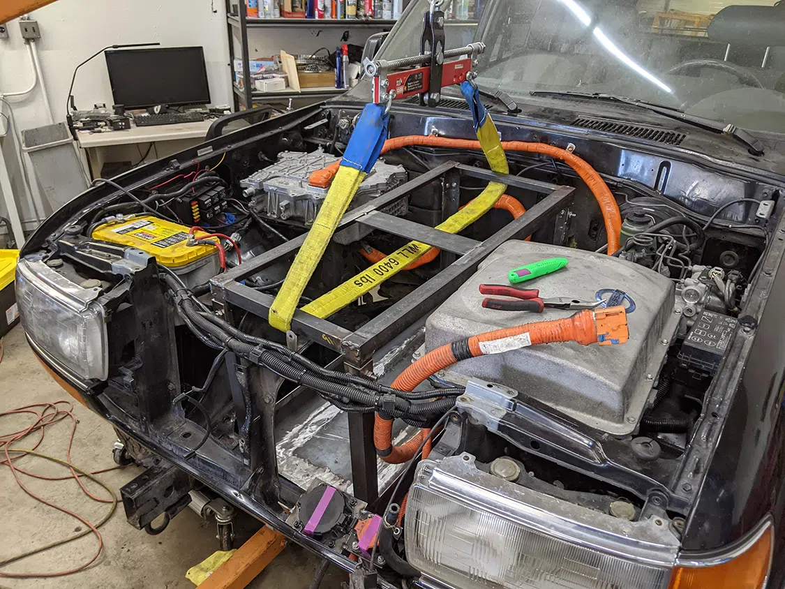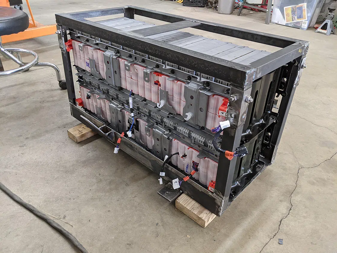 The Resolve-EV controller eased the integration while a purpose-built battery box accommodates the Nissan battery systems, temperature sensors, current sensors, and high-voltage contactors under the hood. It is secured onto the chassis thanks to dedicated mounts.