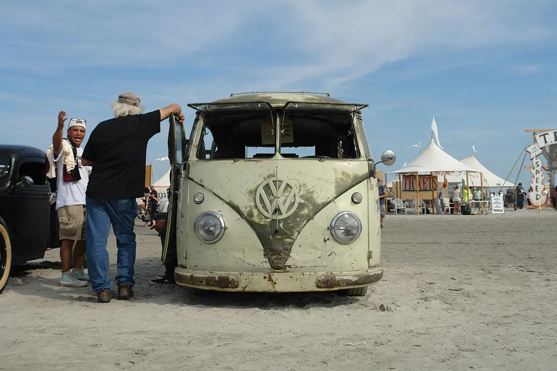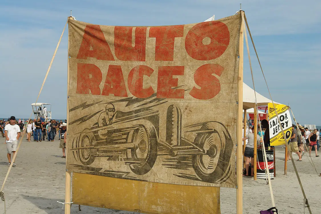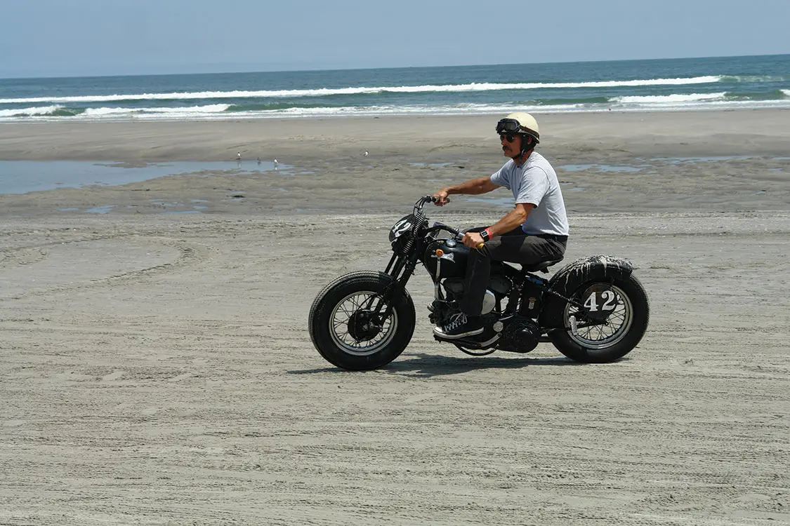 Because that is what we’re really there for, after all. Both days of the events are chock full of vintage motorcycles and hot rod racing down the beach. Drivers are dressed in vintage-style racing gear, with rounded helmets and knee-high laced boots, their jodhpur pants bulging at their thighs. Some cars are in great shape, but others are rusted, dusty, and a whole lot of old school.