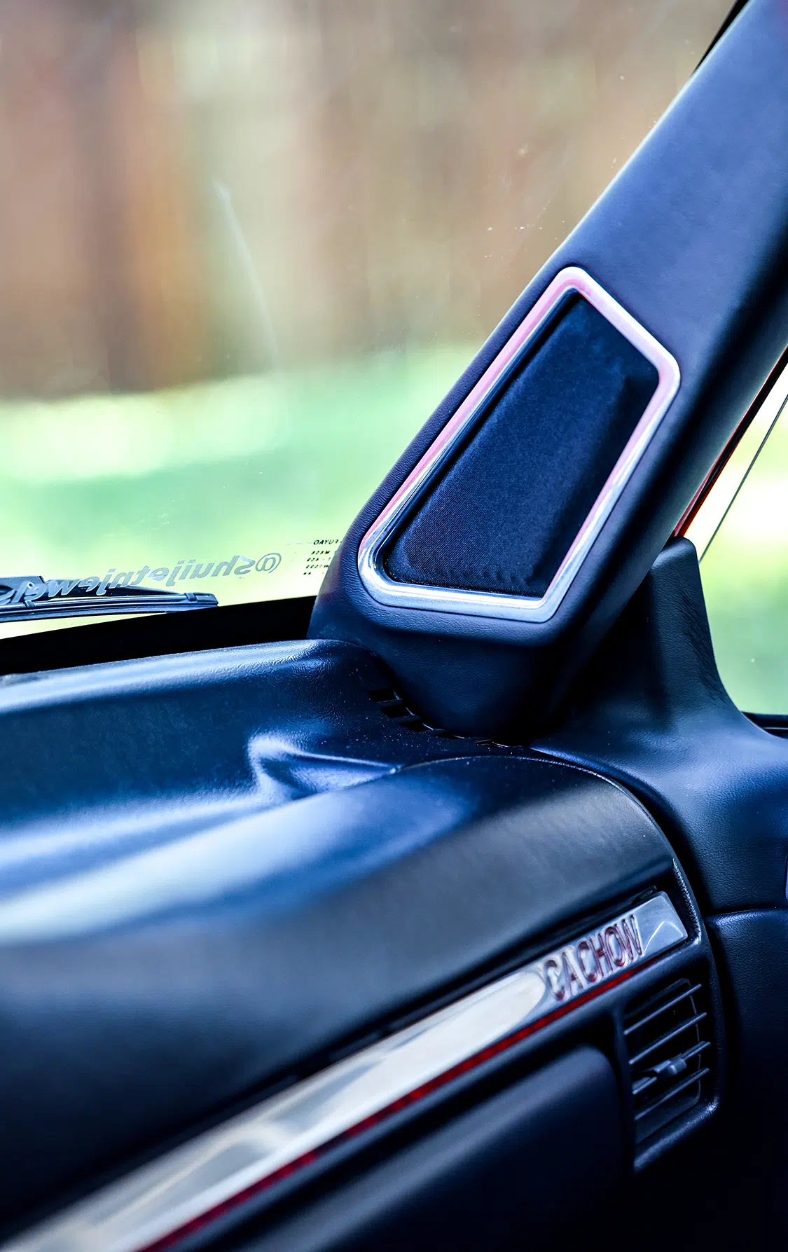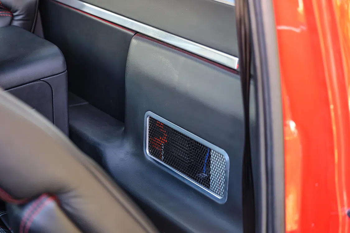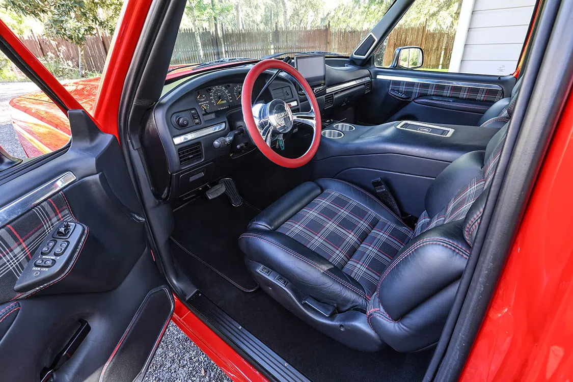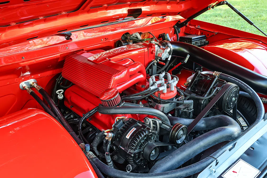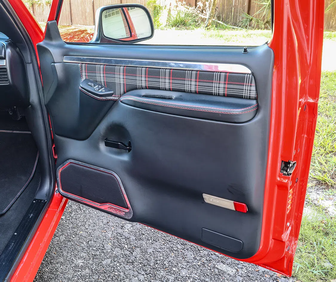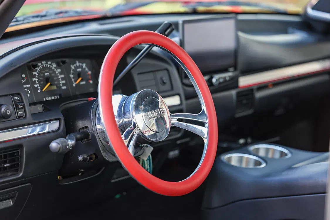 Instead of doubling down on the inclusion of red paint inside of the cab, the restyling of the interior takes a cue from the bed as far as the hues used. Aside from the wrapped Hot Rods by Boyd steering wheel, the majority of the cabin was done in black to promote a chill and subdued environment for cruising. Innerworx in Sarasota, Florida, joined the project to handle all the truck’s upholstery needs, and Eric Ryan at Advance Audio Concepts in Pompano Beach, Florida, lent a hand by customizing the dash as well as wiring up the full stereo system featuring a Stinger Heigh10 infotainment head unit. Since the weather can get a bit hot and humid for the Shulman family in Florida, working in a Restomod Air A/C system was an absolute must before the project was considered complete.