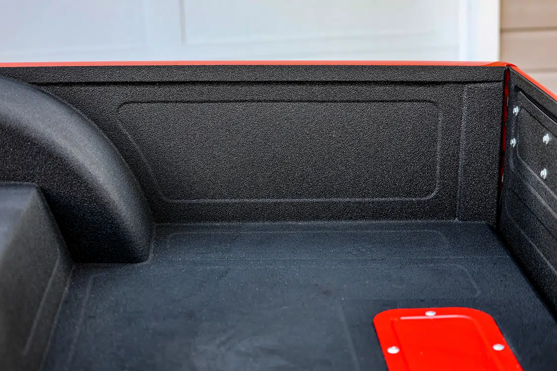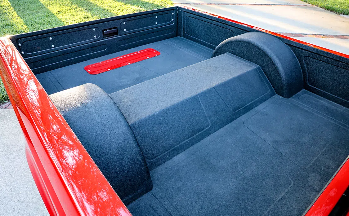 When it came time to finish off the inside of the bed, the custom bead rolled panels that make up the walls and floor portions were coated in Line-X to give the Ford a contrasting pop of color while creating a useable cargo space to comfortably haul around valuable supplies or a stack of Christmas gifts from Santa.Â