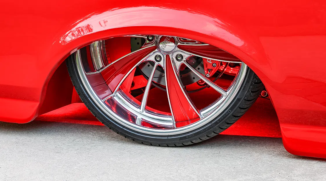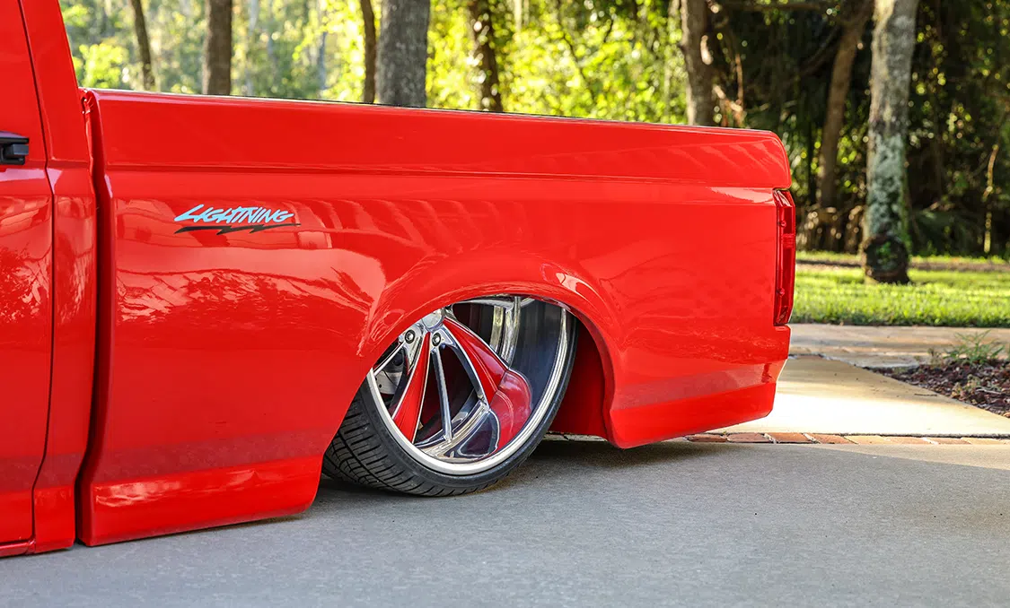 While the Lightning models come lowered about 2 inches from the factory, this ride height just wasn’t going to be low enough for David and Madison. With that in mind, they instead checked the Ford in with Jake McKiddie and the team at Phat Phabz in Choctaw, Oklahoma, for their full custom treatment, which would start with the fabrication of a full custom chassis. This front-to-back frame package features a lock-to-lock turning radius with adjustability of up to 14.5 inches of lift to free up large diameter wheels for unobstructed drivability. Front 2600 Air Lift Dominator air bags along with a parallel rear four-link setup topped with Firestone sleeve ‘bags make for comfortable cruising at just about any speed. This all comes with the highly desirable ability to lay the Lightning down on the ground, tucking the 22-inch front and 24-inch rear Hot Rods By Boyd wheels up into the body with ease.