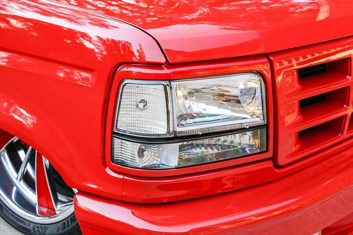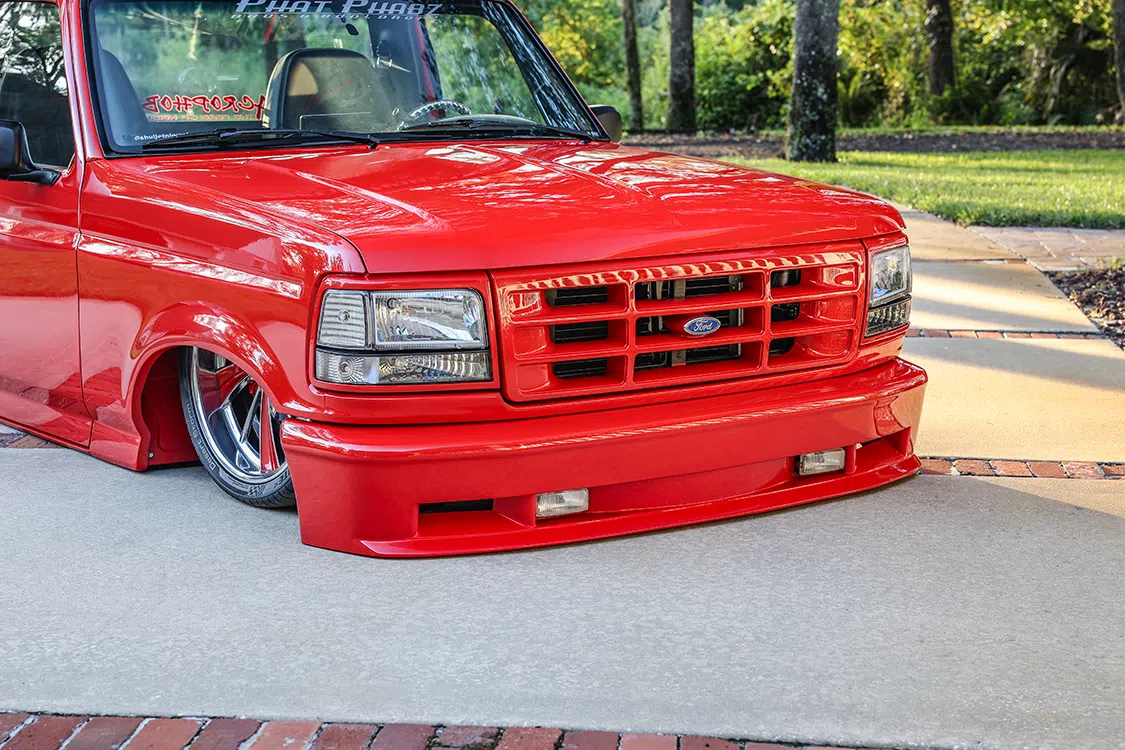 Before the engine was replanted underneath the hood, the bay was treated to a set of tubs and bodywork to get it prepped for its final stage of paint. The same process was also rolled out to the rest of the Ford’s exterior landscape, as the body was shaved clean of the drip rails, cab seams, and wiper cowl. These alterations, as labor intensive and necessary of a skilled hand as they are, cleaned up the Lightning’s façade enough without performing too many modifications. To further change up the frontend a few degrees, a custom front air dam/bumper was created, and a GrantFab roll pan was utilized to better round off the rear. These mods to the Ford gave David and Madison’s truck a one-of-a-kind appearance without calling attention to every single tweak that has gone into streamlining its appearance. Only those who are very familiarized with these first-gen Lightning models will pick up on everything included in the truck’s exterior restyling.