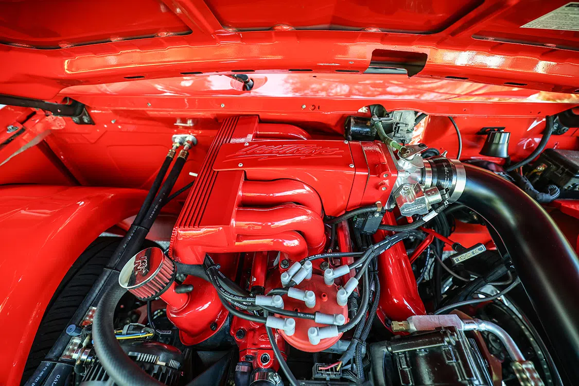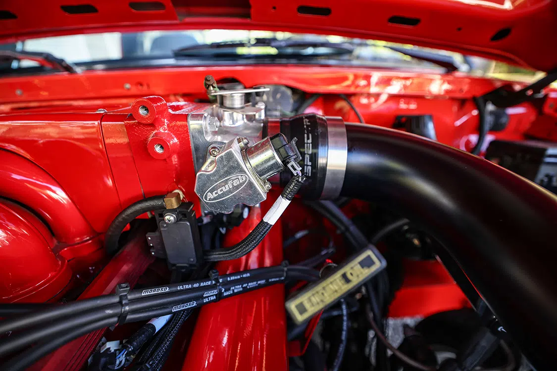 Building the frame from scratch bought David some time to arrange for the factory 5.8L engine to be plucked and rebuilt. To assist with this, he turned to Gerald Brand of Brand Racing Engines in Oklahoma City to tear the Lightning’s factory-equipped powerplant down and beef it up from the inside out. Along with the general gutting and cleaning process, Gerald outfitted the V-8 with Diamond pistons, Crower camshafts, Scorpion roller rocker arms and lifters, as well as created full custom air intake and exhaust systems. The result of the engine rebuild process netted a better-than-stock, still-numbers-matching engine that has the capability to rumble meaner than ever before.