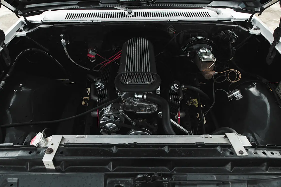 Under the hood of the C10 sits a classic Small Block Chevy V-8 built atop a BluePrint block, but that’s only where it starts. Built to be twin turbocharged by the previous owner, the engine features a hydraulic roller camshaft, Edelbrock Performer EPS intake manifold, Holley 750 cfm carburetor, and a MSD 6-BTM ignition system. Expelling the truck’s spent fuel is a custom 3-inch exhaust system with long tube headers, an X-pipe and two Flowmaster Super 10 Series mufflers.