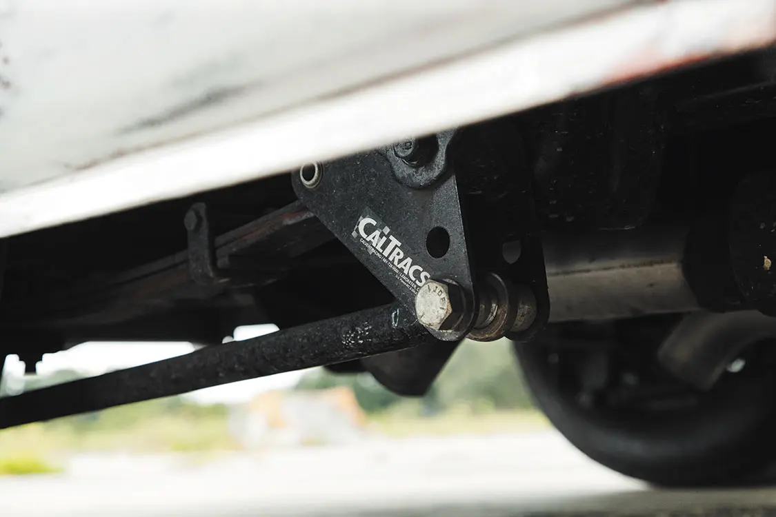 Backing the SBC is a fully built TH400 transmission with a full manual valve body. Adding even more fun to the truck is a 3200-stall torque converter and a Hurst ratchet shifter. The Turbo 400 spins a Precision Shaft Technologies driveshaft, which then in turn spins Moser Engineering axles by way of a 12-bolt Positraction rear end, featuring 4.56 gears. Other notable features on the truck include a driveshaft hoop, to contain the driveshaft if major failure occurs in the U-joints or elsewhere, as well as a CalTracs traction system from Calvert Racing.