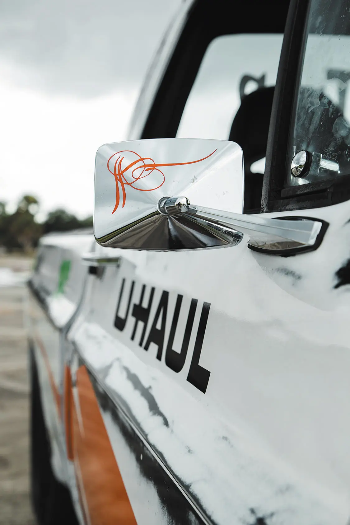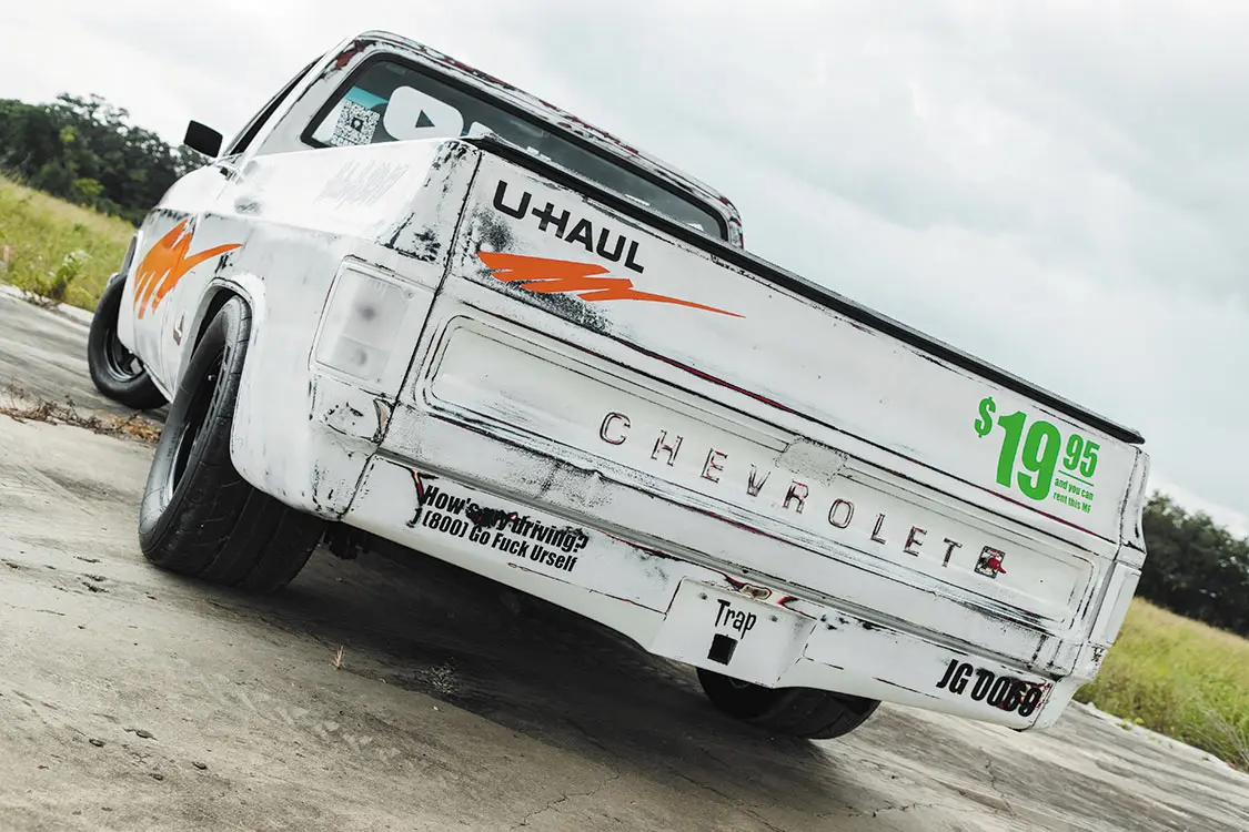 To create the unique patina on the C10, Jhan used White Rust-Oleum paint and then sanded it down in all the right places, making the truck look as though it had sat out in the elements for years. He then painted the orange U-Haul slashes on either side, and finished it off with the U-Haul logo and other custom graphics, including a green $19.95 rental price sticker.