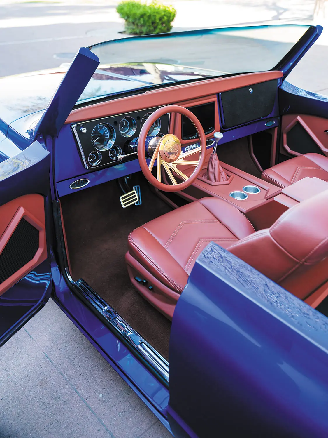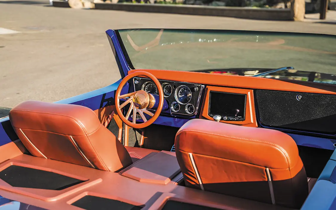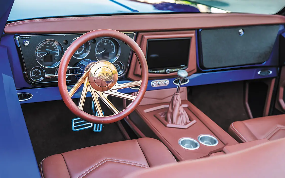 With the Blazer nearing completion, Omar then reached out to Intro Wheels for a quick brainstorming sesh, where it was decided to go with 24×9 and 24×15 concave rose gold Twisted Infamous billet wheels to really set off the brilliant blue paint! The roadster then went off to Peñabros Customs to tighten up all of the loose ends, which included installing the drivetrain, the complete 510 Car Audio interior, fresh stereo, A/C, exterior trim, and everything needed to get it roadworthy.