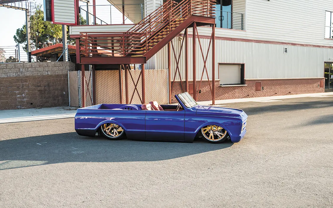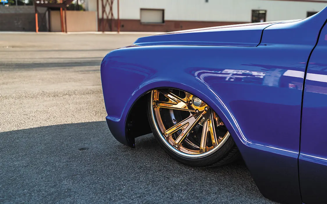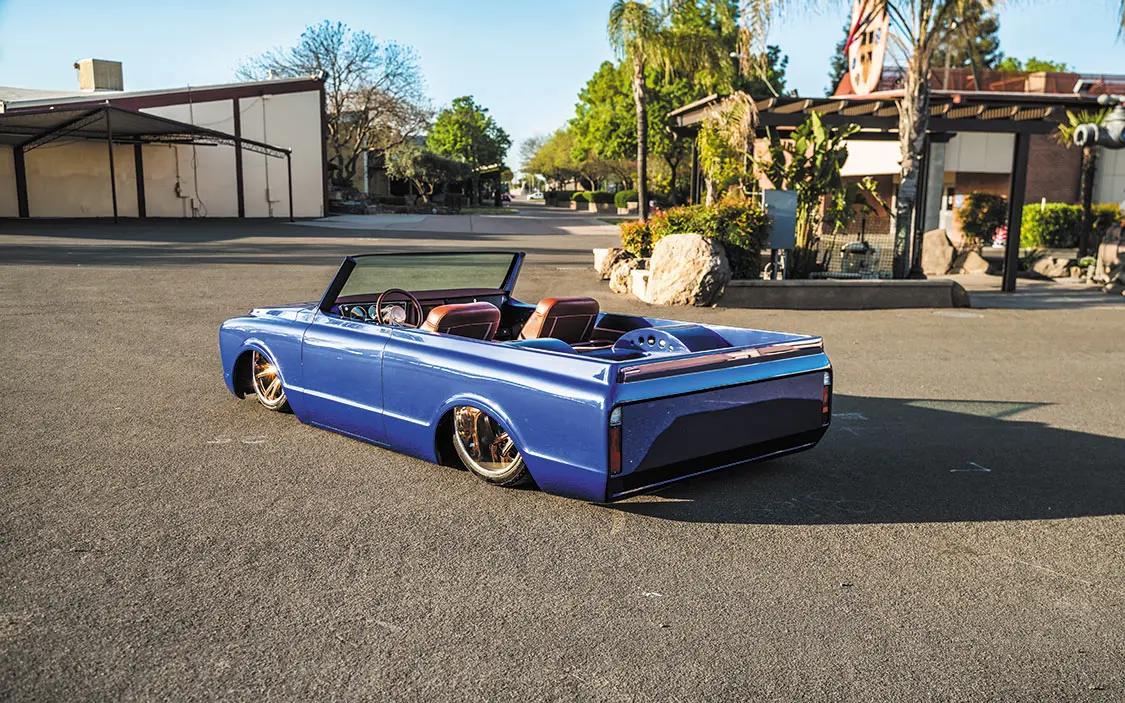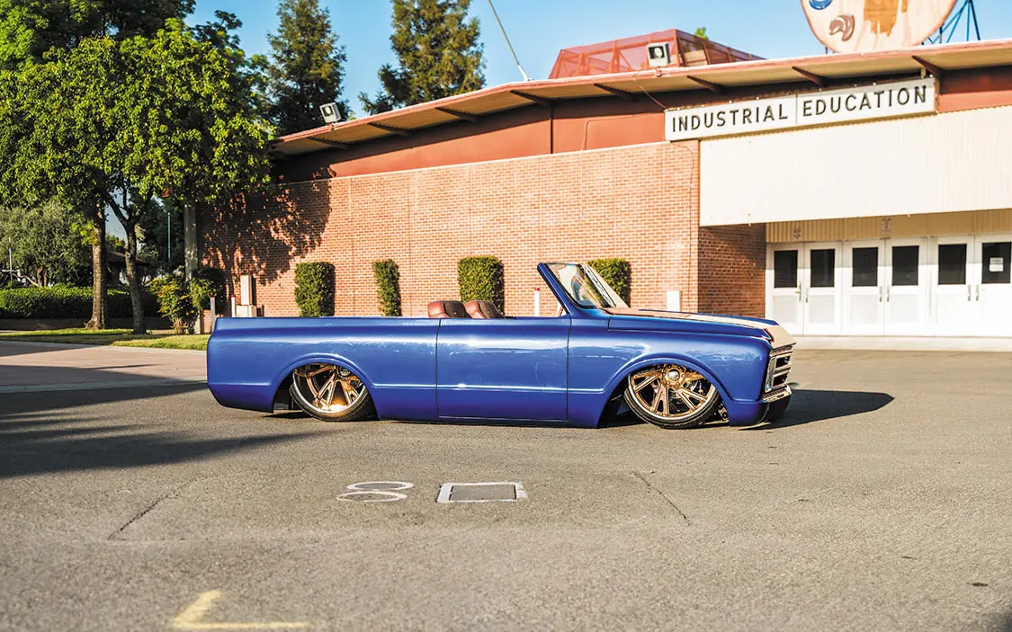 “It was going to be a simple K5 Blazer, bodydropped on 24-inch Racelines I had bought for it,” he said. “I took it to my buddy’s shop, Castro’s Fabwerks in San Martin, California, where he worked off the original frame. He Z’d the front 3 inches and added a Stone Fab 3-link kit, an AccuAir VU4 block, and used POR-15 to paint the frame. It was done plain and simple, then it was off to Jesus Ramirez for bodywork and paint.”