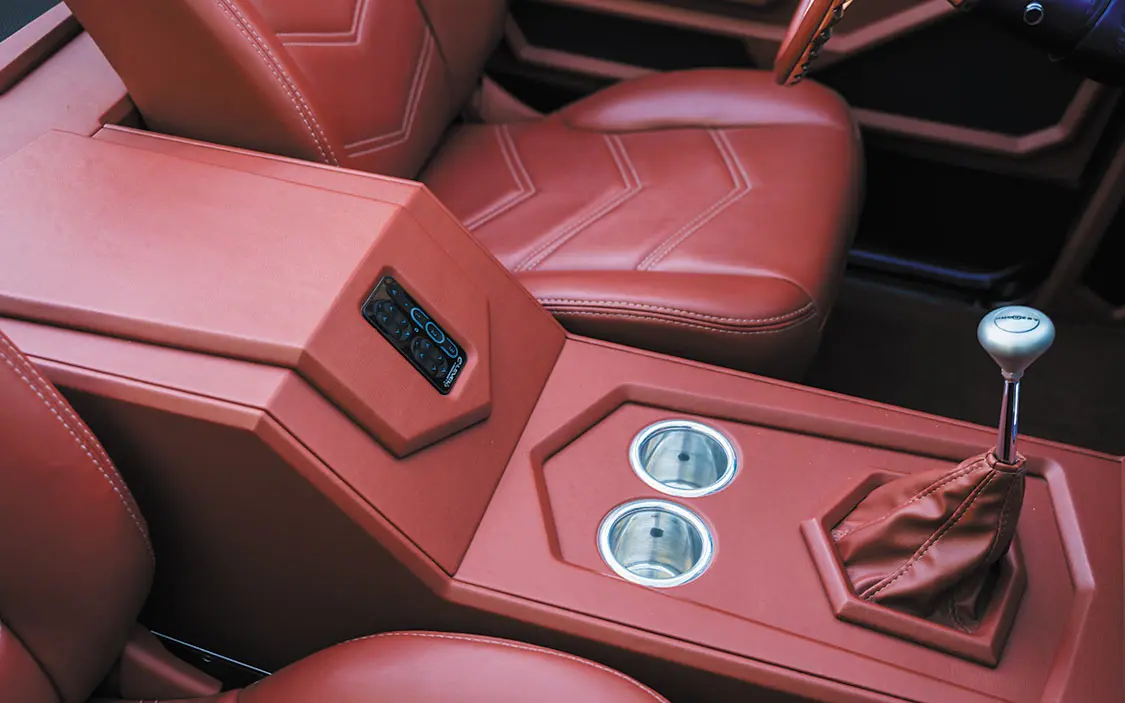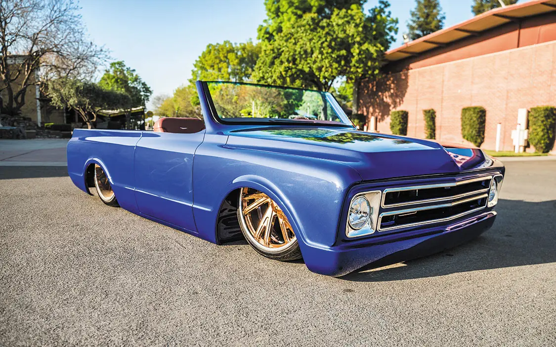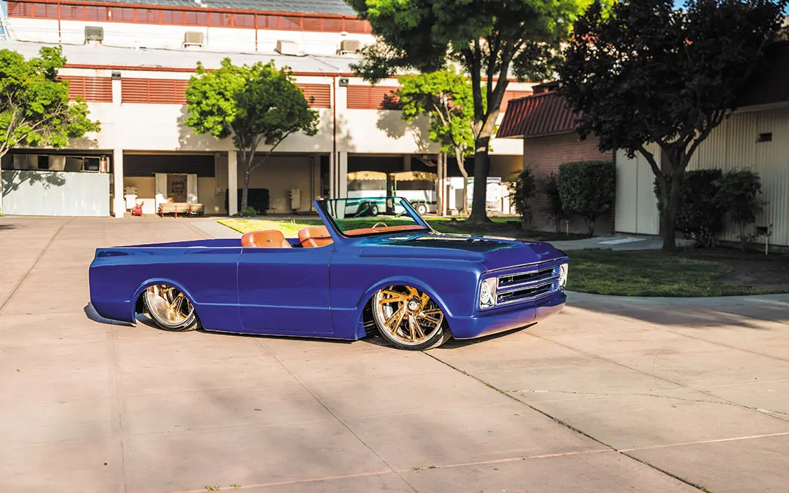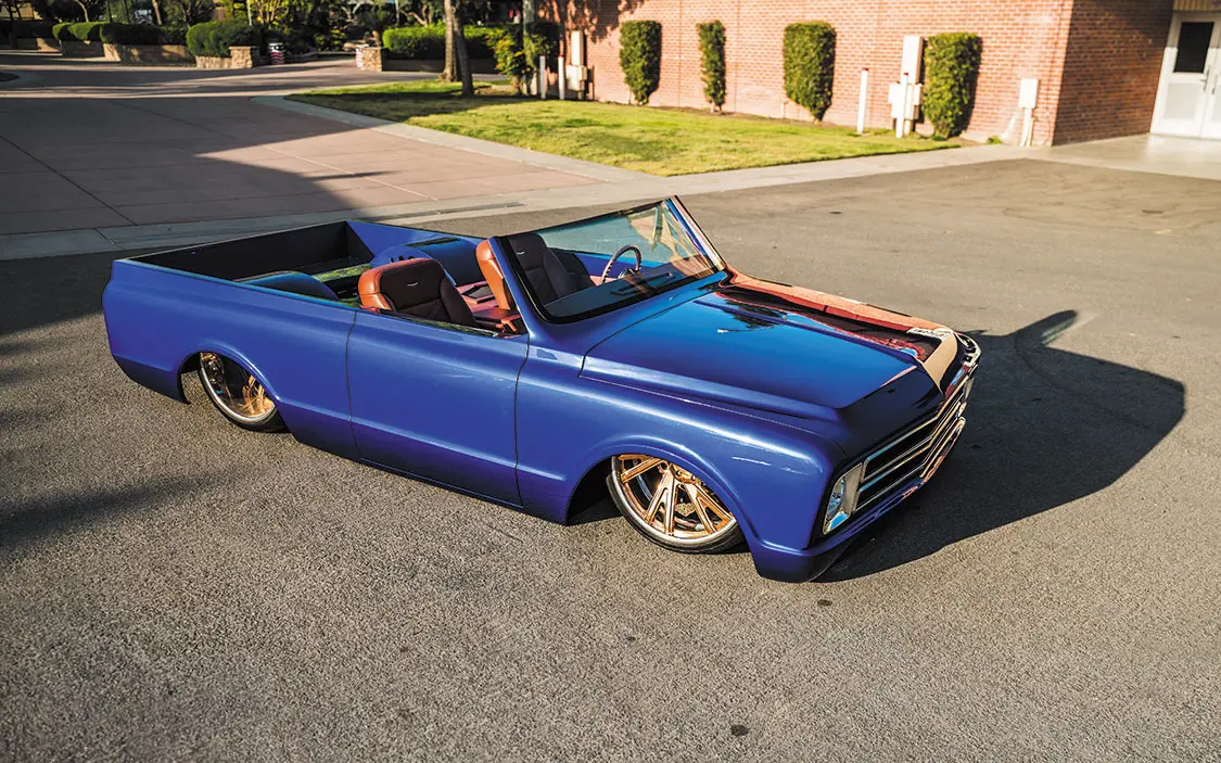 “It was going to be a simple K5 Blazer, bodydropped on 24-inch Racelines I had bought for it,” he said. “I took it to my buddy’s shop, Castro’s Fabwerks in San Martin, California, where he worked off the original frame. He Z’d the front 3 inches and added a Stone Fab 3-link kit, an AccuAir VU4 block, and used POR-15 to paint the frame. It was done plain and simple, then it was off to Jesus Ramirez for bodywork and paint.”