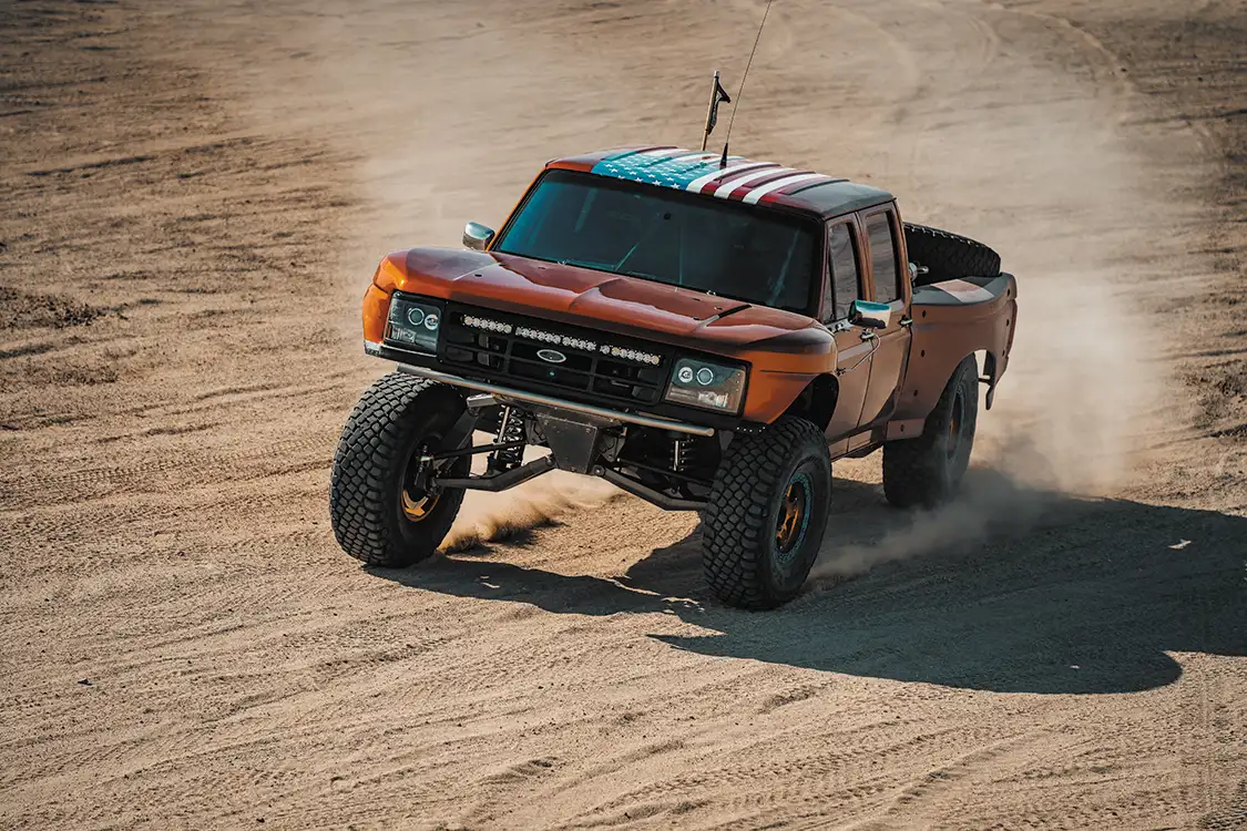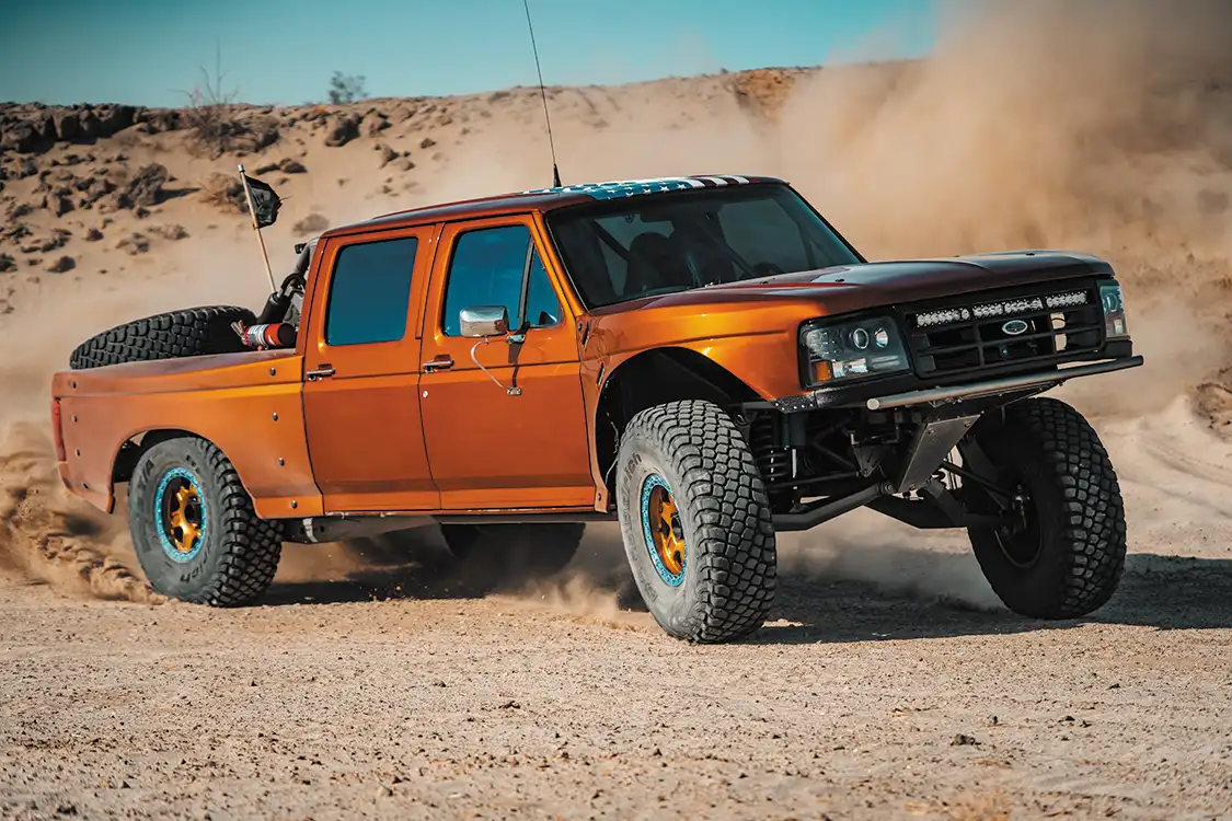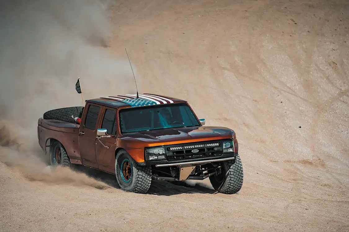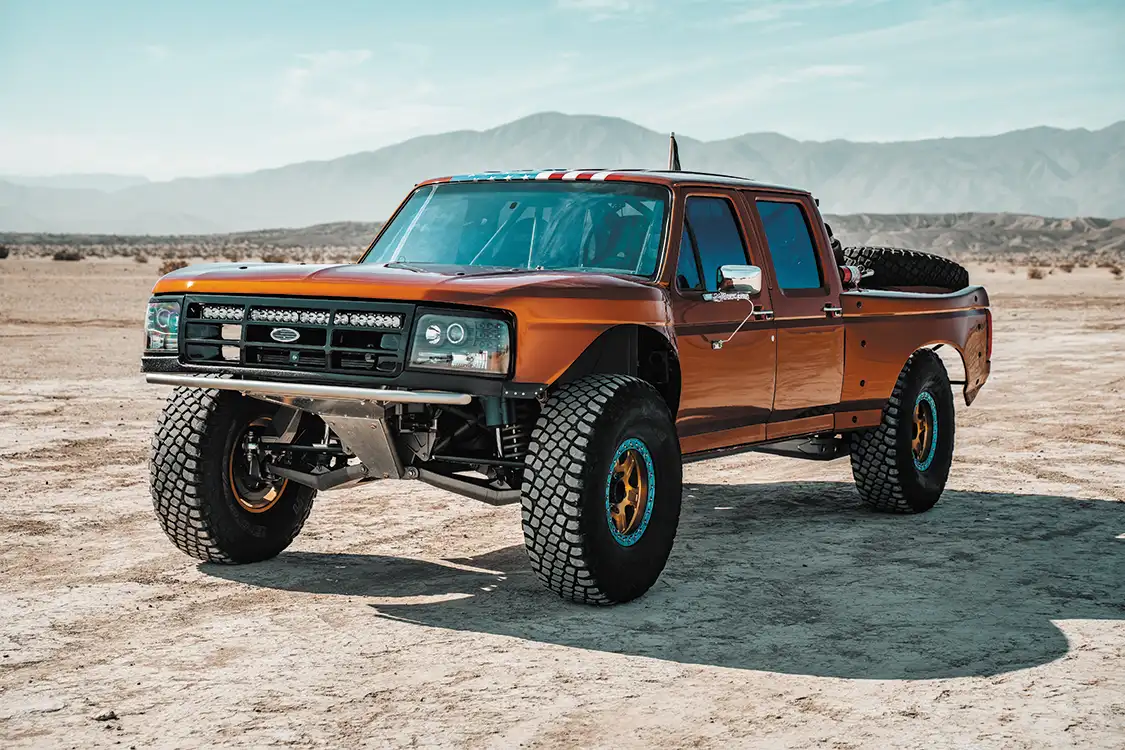 Your dad may have had an OBS Ford pickup back when you were younger, but we guarantee it wasn’t as cool as Paul Fisher’s F-350. Known as All-American Sender for obvious reasons, this full-size Ford launches into the sky like a rocket ship and lands with cat-like grace. All Paul wanted was a legit freestyle prerunner, and one the dust settled, that’s exactly what he got. While the trail to get here hasn’t been quick, or cheap for that matter, Paul continued to grind at a steady pace, reminding himself to listen to what his truck needed along the way.