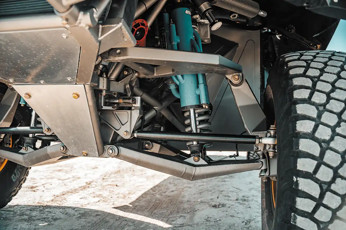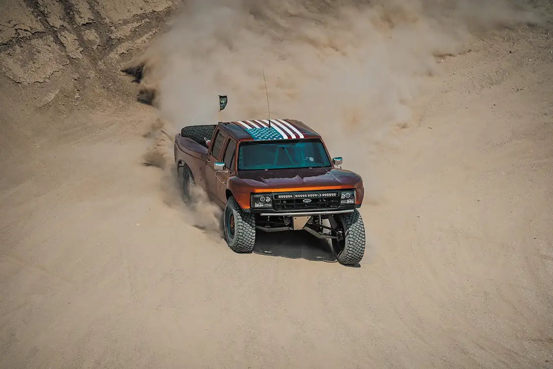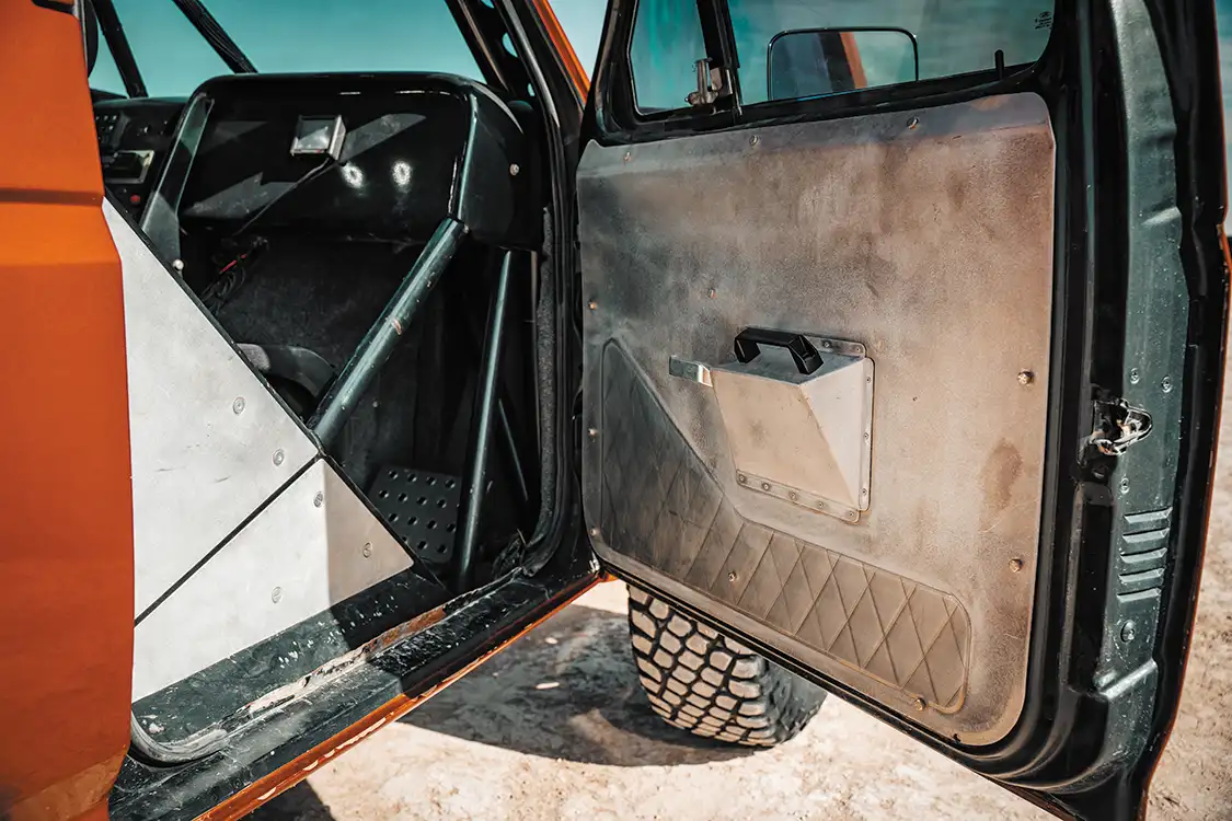 To get this truck moving, Paul installed a GM 376 ci LS3 crate engine and pushed it far back towards the cab. A few performance upgrades in the form of a Holley EFI system, custom headers by Jeramiah Grenell, and a 3-inch exhaust system complete with Borla mufflers were made to the already capable GM mill. Maximum Transmissions in Hesperia, California, then backed the LS3 up with a TH400 3-speed automatic transmission with a reverse manual valve body. Paul’s power source of choice was a good one and has more than enough muscle to thrash through the dirt with ease. Paul was in search of reliability, brawn, and durability, and that is what he has underneath the strut-powered hood.