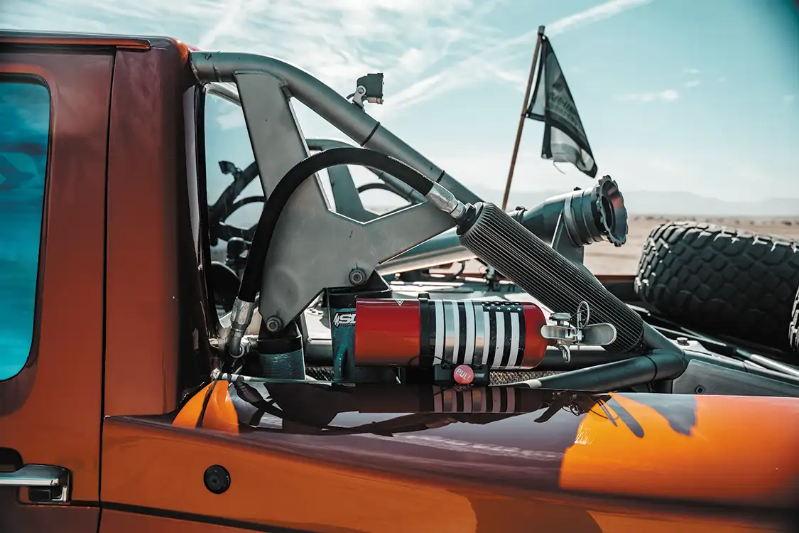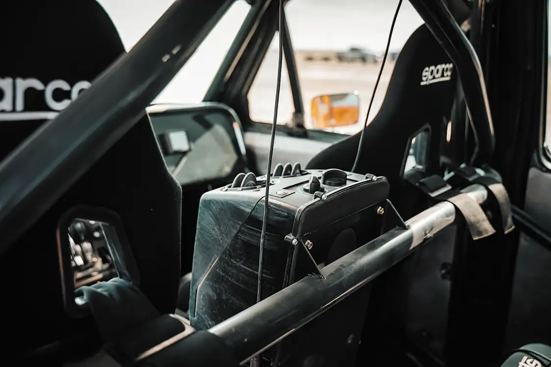 Of course, the entire OEM suspension setup was gutted. In its place, Paul assembled a massive upgrade from stock using a Dirt King tubular frame, a center-mount A-arm front setup, a 4-link system at the rear, and a trophy truck steering rack from Power Steering Solutions. King shocks and springs have also been thrown into the mix, as have 17-inch Innov8 G400 wheels and 40-inch BFG KR3 tires. Wilwood braking components bring this beast to a controlled halt, and a Harmon Racing 50-gallon fuel cell ensures that Paul can send his truck flying into the night without worrying about gassing up so soon.