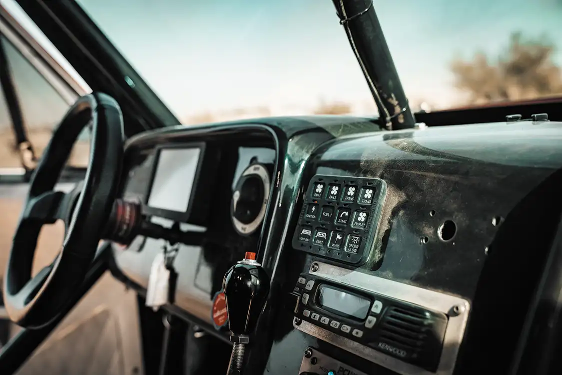 Paul went this far with his F-350, and he had no intention of skimping out on its interior space. Four Sparco seats are present, front and rear, to ensure the entire family can tag along. A center-mounted A/C unit creates a cool environment inside of the cab—even on the hottest of days. A fiberglass dash has been stuffed with two separate Switch Pros panels specifically set up for use when the truck is on the streets or off-roading. A Dirt King 2-inch DOM roll cage takes up residence within the cab for safety’s sake, and custom door panels and a headliner give the Ford’s cockpit a slick, utilitarian appeal. A PCI Race Radios intercom system with four headsets allows Paul and his passengers to have constant communication without having to shout at him to drive faster.