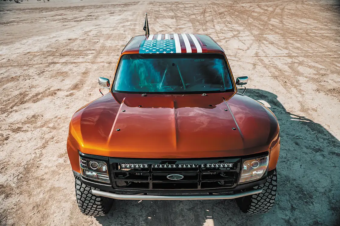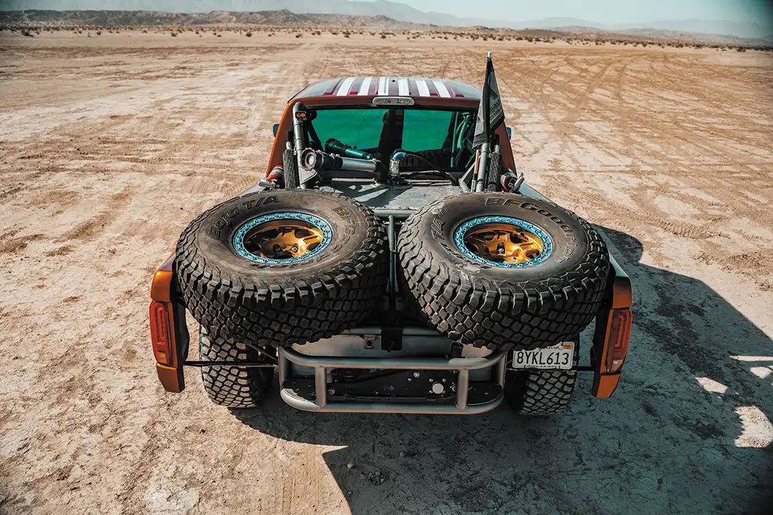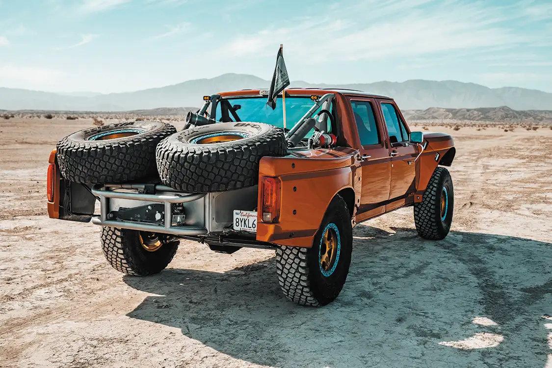 With the F-350 outfitted with bulletproof suspension and drivetrain systems, the next phase of the build was to prep its exterior for action. Chevrolet Camaro ZL1 Vivid Orange Metallic paint was utilized to give the Ford a gleaming shine, while an American flag graphic was added to the roof of the cab for a bonus touch of class. FiberwerX fiberglass flared fenders were also added to provide plenty of clearance for the beefy tires to tuck into during moments of full send. Custom tube bumpers were added to each end, and Baja Designs LED lights were stuffed behind the grille for additional illumination for nighttime shredding. Two full-size spares are bolted into place in the back and sit atop a platform that lifts, providing valuable storage space in a small trunk space below.