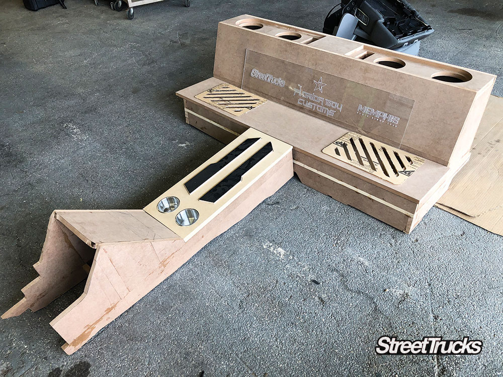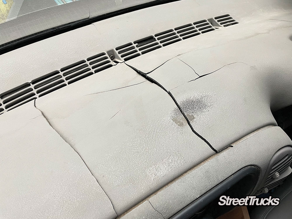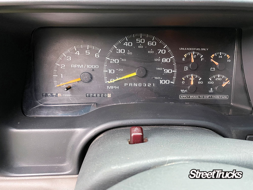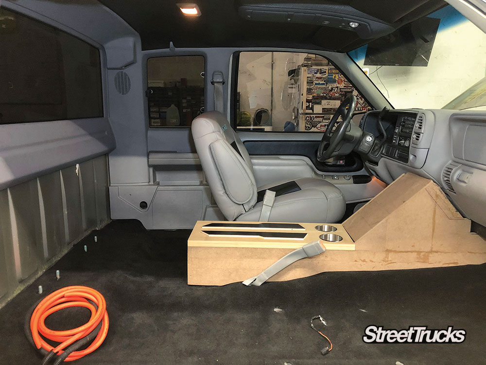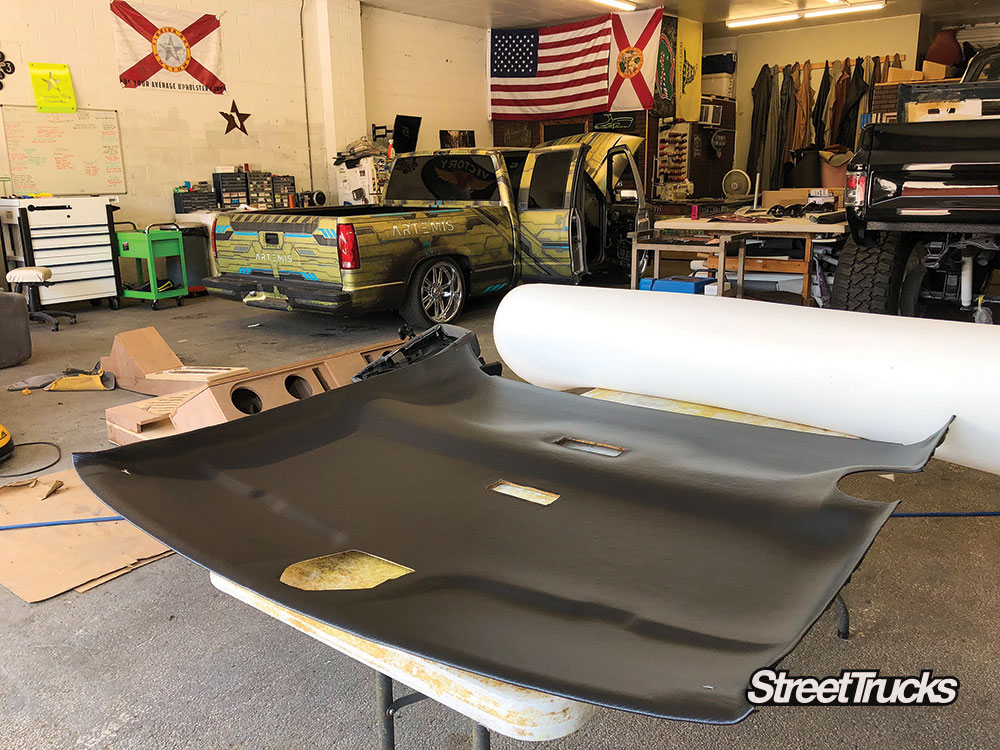 To catch everyone up, our ’98 GMC Sierra known as Artemis has been fully bagged on a bolt-in air-ride suspension from Ridetech. We added 20-inch wheels and some upgraded EBC brakes before sending it off to Glarb Designs for a one-of-a-kind vehicle wrap like no other. Light-up panels and reflective vinyl highlights help this “Ready Player One” inspired OBS stand out at the truck show. A full bed wood kit covers the freshly Rhino-lined bed floor, and all new light housings were added both front and back. Now, the truck looks good and runs flawlessly, so we need to focus on the weakest link: that old worn-out interior.