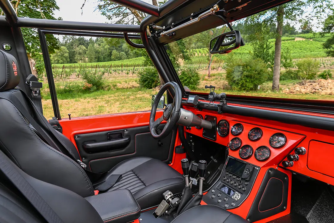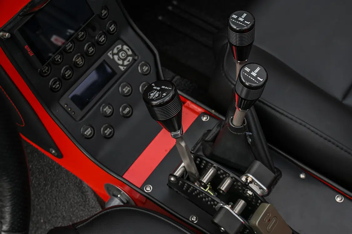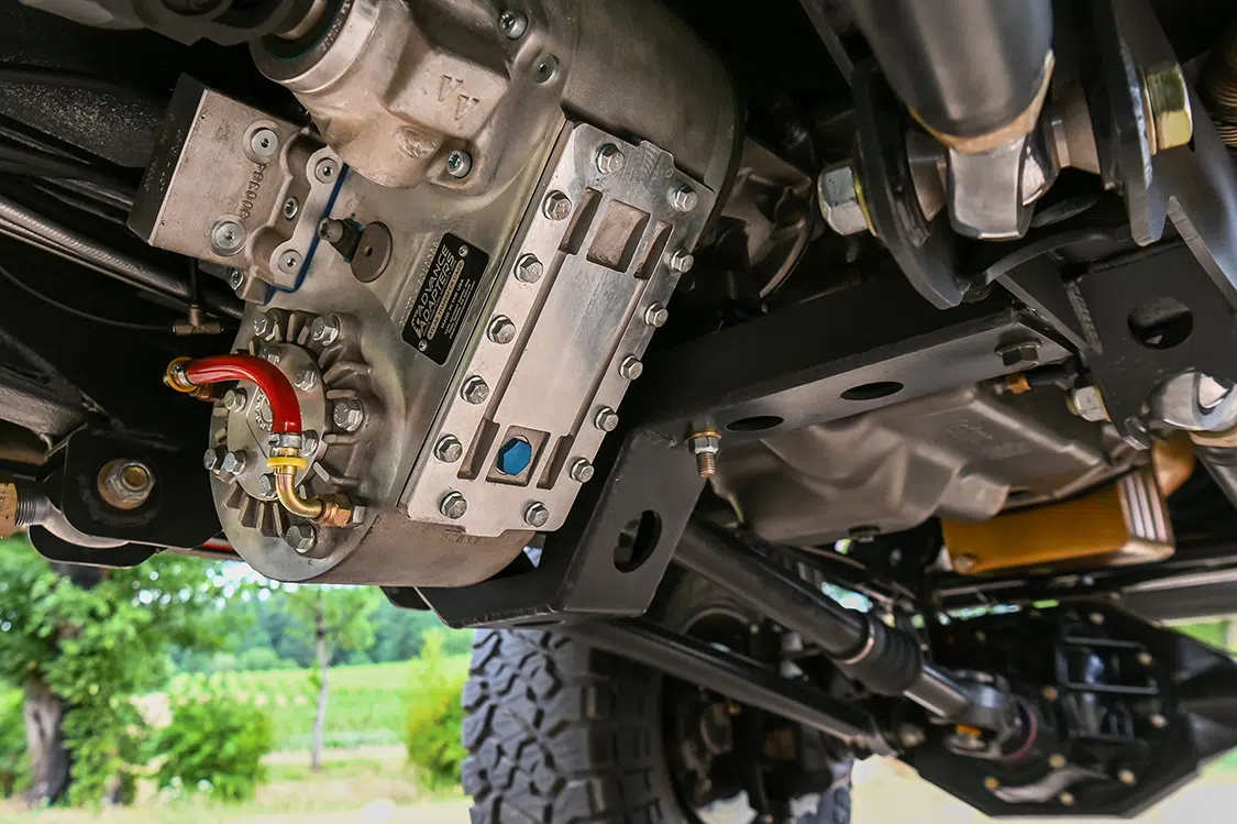 All that power is sent to the wheels through a Stage 4 Gearstar Ford E4OD transmission with a 3,200 rpm-stall billet torque converter. It is controlled by an HGM Electronics’ Compushift and RADesigns’ customizable Winters shifter, which has a selectable bump-shift. A stout Atlas II Pro 3.8:1 transfer case is mounted behind that custom built transmission and, of course, operated with a JB Custom Fabrication twin-stick cable shifter.