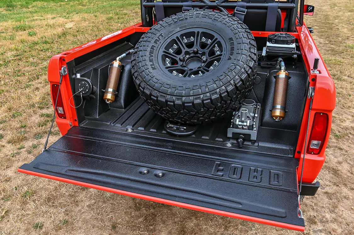 The heavily modified frame got a parallel four-link up front and a double-trianglulated four-link in the rear. ORI struts, 12-inch remote reservoir in the front and 14-inch in the rear, keep this machine running smooth across any terrain, without the use of traditional springs. 4-inch Fox nitrogen bump stops up front also ensure smooth landings if this Bronco gets a little wild.
