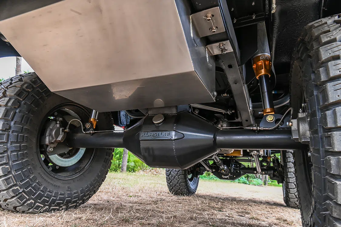 A pair of Tom Woods custom off-road drive shafts, fitted with 1350 CV joints, move the power further down the drivetrain to the axles. RuffStuff Specialties’ Ford 9-inch housings have been fitted with Dana 60 full-float outers, which are running 35-spline Dutchman USA Chromoly axles, and have Wavetrack 4.86:1 gears. From there the front and rear are modified further with torque biasing differentials, armor, trussing, and eight-lug flanges. Strength, even with the high horsepower motor, is not a concern with these axles.