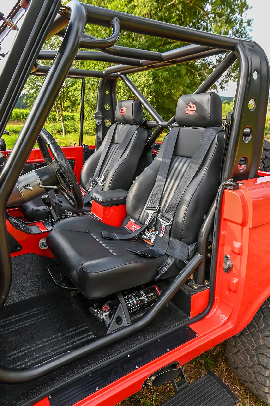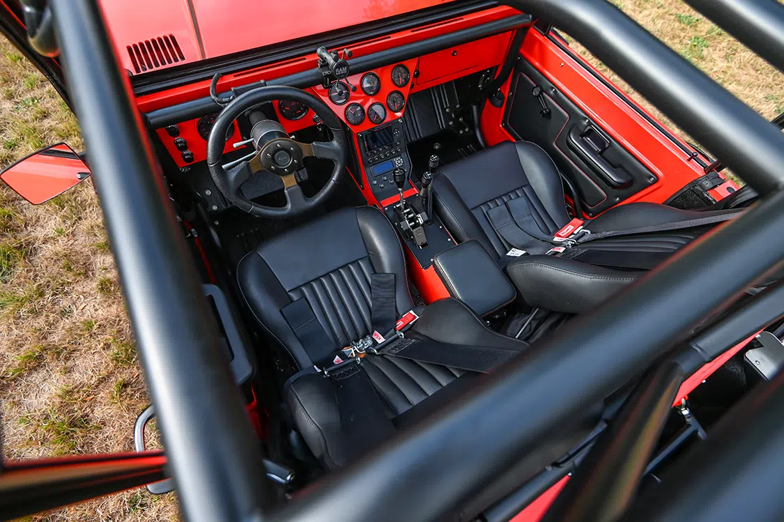 The Rest: AMP Research Power Steps, Custom Bumpers, Custom Stainless Steel Headers, Tom’s Bronco Parts Deluxe Seats, Wet Sounds 10-Speaker Sound Bar, Flaming River Steering Column, Custom Center Console w/ Color Matched Custom Switches, Custom Speedhut Gauges/Instrument Clusters, Lux Lighting Programmable Auxiliary Lighting, Rigid Lights Front & Rear, BC Broncos Half-Cab Soft Top, Simpson Harnesses, Custom Half-Cab Roll Cage, Wild Horses Stainless Steel Fuel Tank, Fitech Dual In-Tank High Volume Fuel Pumps, Stainless Steel Fuel/Brake Lines, Wild Horses Wilwood Hydroboost Brake Master Cylinder/Booster (MOAB brake kit), ARB Twin Air Compressor, Rotopax