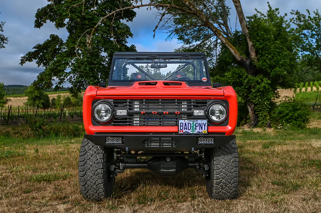 From afar this build just looks like a clean, and bright orange, half-cab ‘74 Bronco. That look is by design, but as you get closer you quickly realize this is no ordinary classic American 4×4. The big 35-inch A/T tires wrapped around 17-inch Hutchinson double-bead-lock aluminum wheels are probably the first giveaway. But, then you realize literally nothing on this build has gone untouched.
