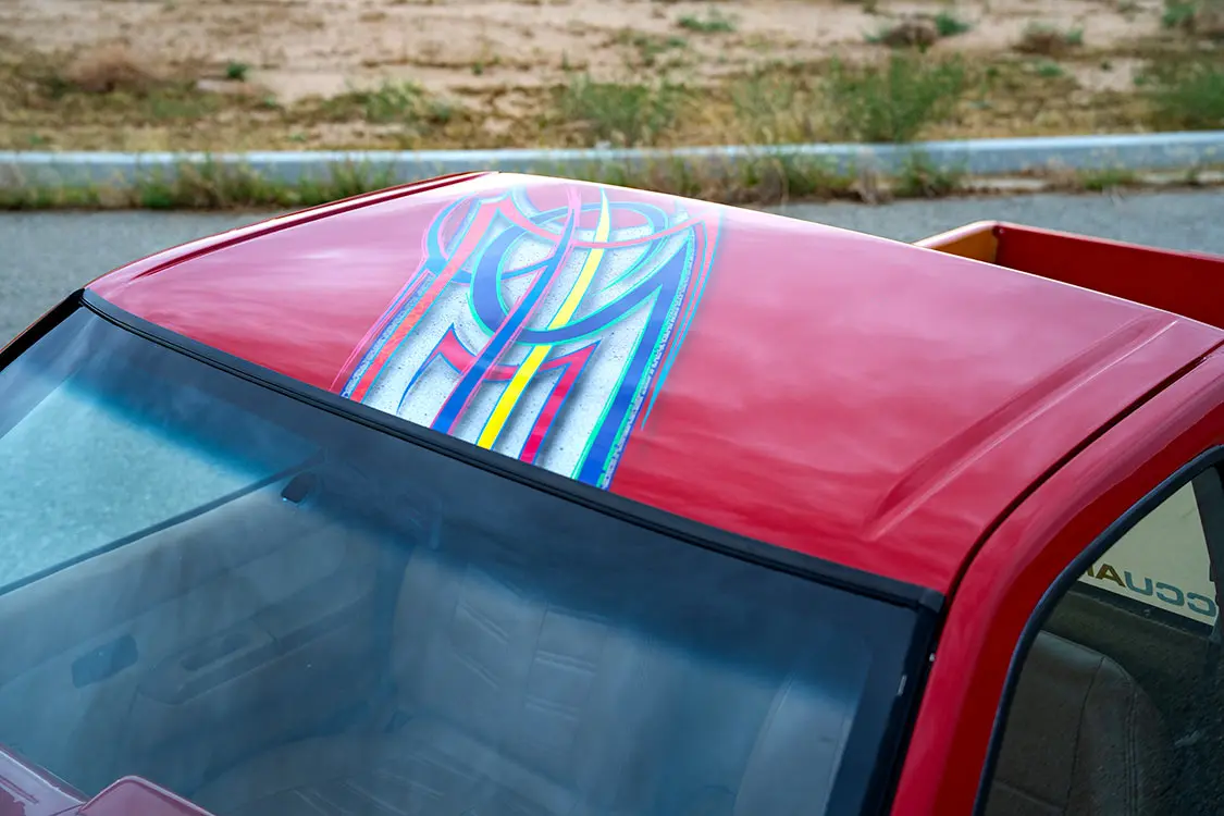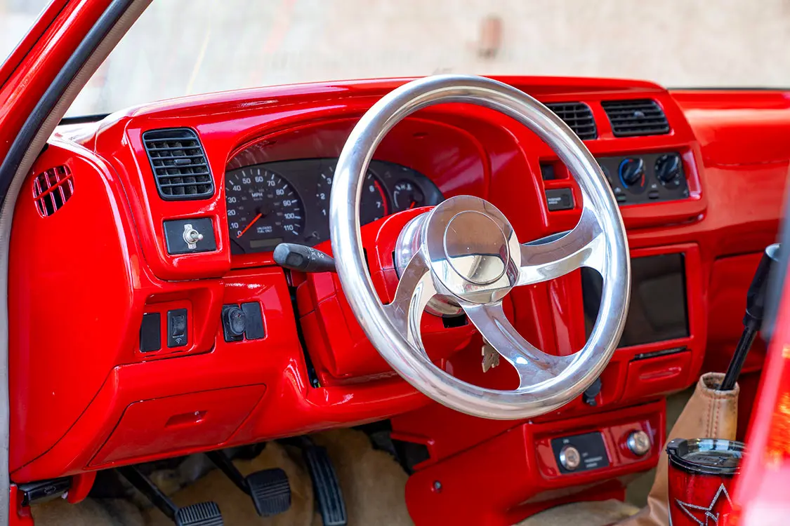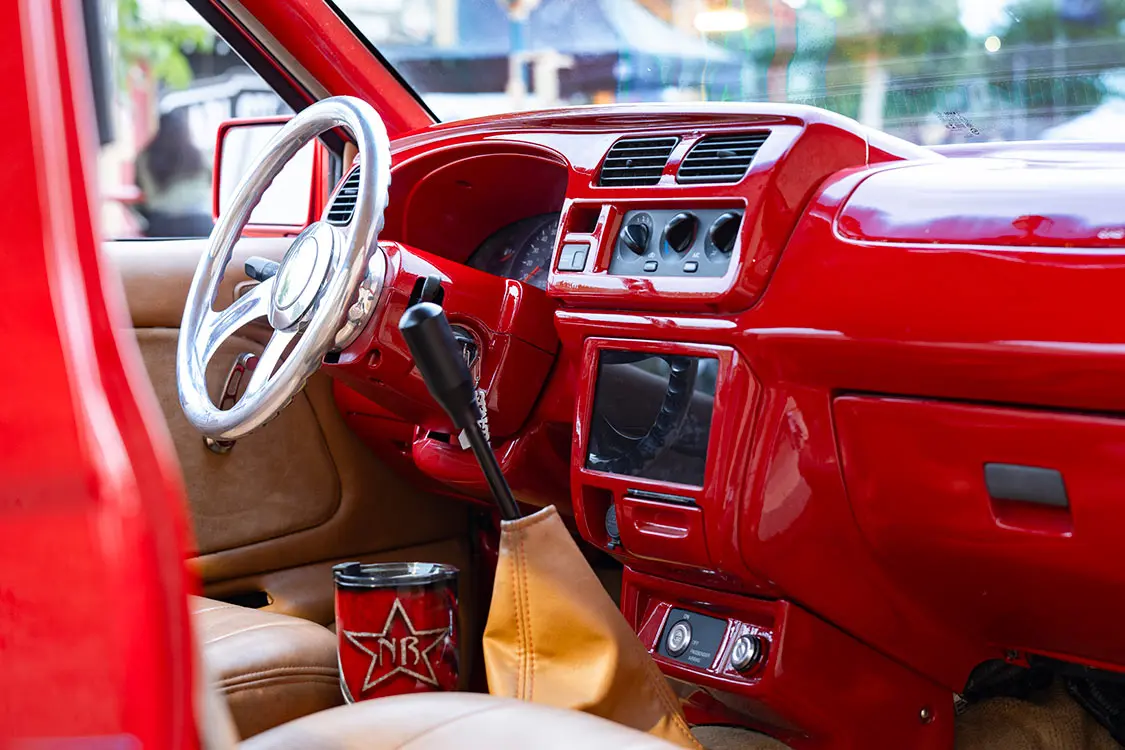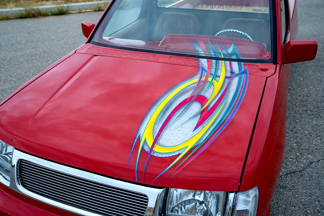 Jordan had the truck painted red and happily drove the truck as it was for a while, but he had an ace up his sleeve that he would soon play. His dad has been friends with legendary custom painter Kyle “K-Daddy” Gann for quite a few years, so when he had enough cash set aside to pull the trigger, he called K-Daddy up to get on his waiting list. As you can see, he definitely delivered! Using House of Kolors’ finest pigments, Kyle spent hours upon hours taping off his designs, then sprayed pink, blue, yellow, orange, and silver onto the truck, including the dashboard. Some might call it peak old school, but we think it’s prime 2024—time for everyone else to catch up!
