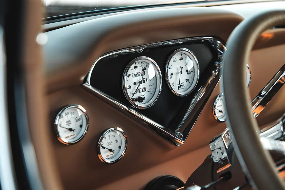 Of course, the interior had to look as good as the exterior, so Cory once again went to work, this time reupholstering the Apache and installing classy Snowden bench seats along with full door panels, German velour carpet, and a custom sheetmetal dash. The interior is another one of the truck’s most notable features.